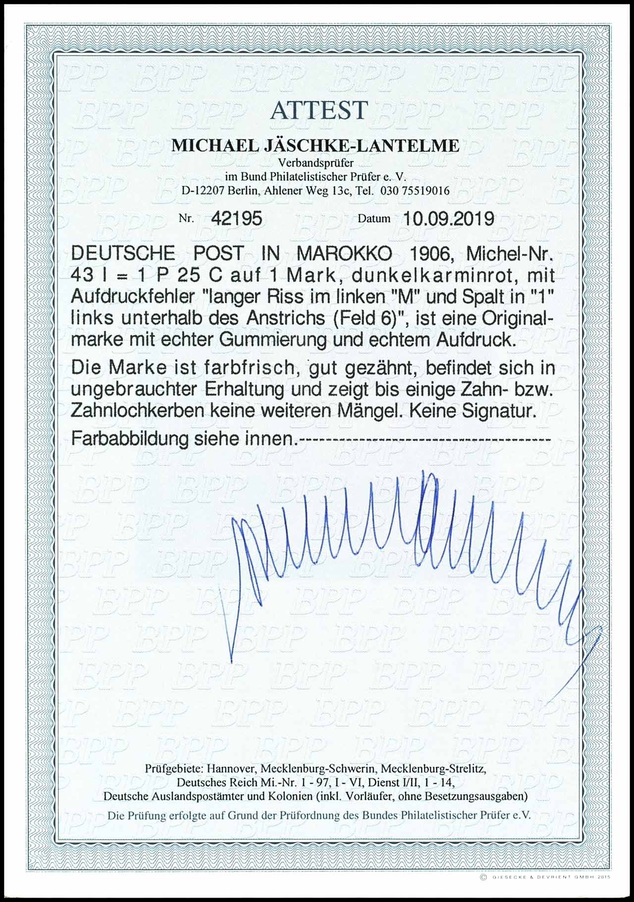 1 Pes. 25 Cts. auf 1 Mark dunkelrotkarmin, Aufdruckfehler " langer Riss im linken M und Spalt in 1 links unterhalb des Anstrichs", ungebraucht, Fotoattest Jäschke-L. BPP "befindet sich in ungebrauchter Erhaltung und zeigt bis auf einige Zahn-bzw. Zahnlochkerben keine weiteren Mängel", Mi. 550.-