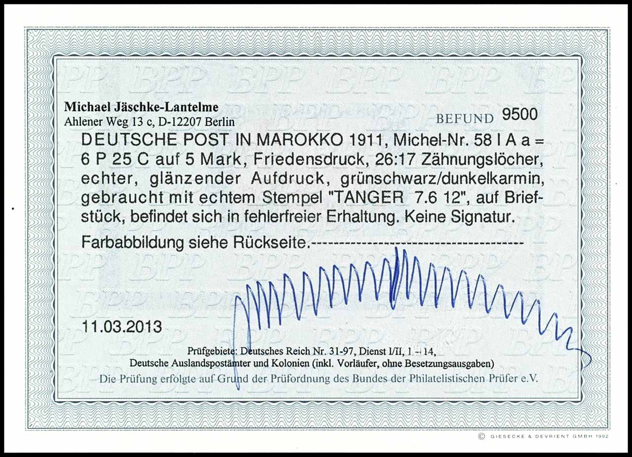 6 Pes. 25 Cts. auf 5 Mark grünschwarz/dunkelkarmin, Briefstück, tadellose Erhaltung, Fotobefund Jäschke-L. BPP "befindet sich in fehlerfreier Erhaltung", Mi. 420.-