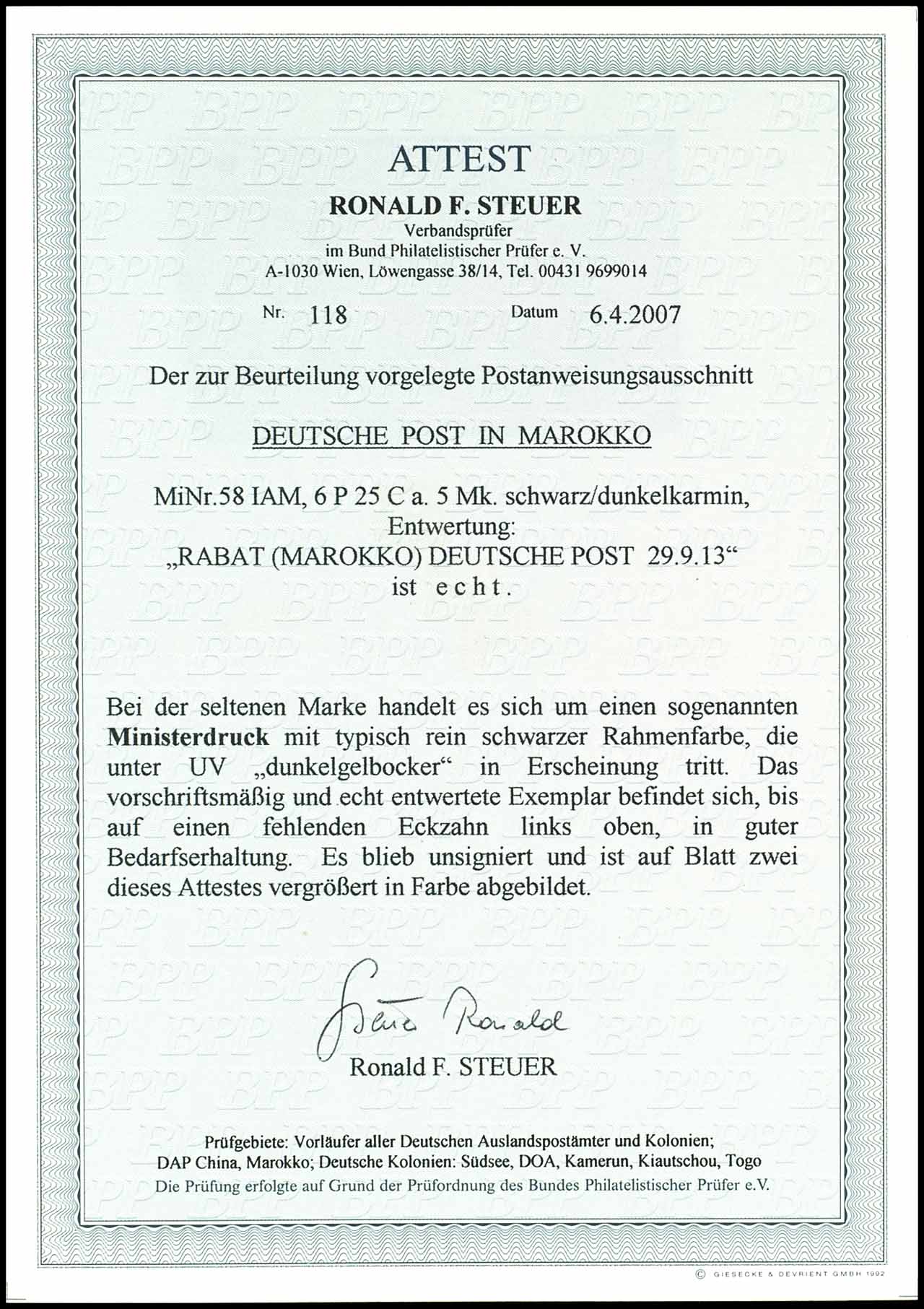 6 Pes. 25 Cts. auf 5 Mark schwarz/dunkelkarmin, Rahmen unter UV dunkelgelbocker, sogenannter "Ministerdruck", Postanweisungsabschnitt, Fotoattest Steuer "befindet sich, bis auf einen fehlenden Eckzahn links oben, in guter Bedarfserhaltung", Mi. 1.500.-