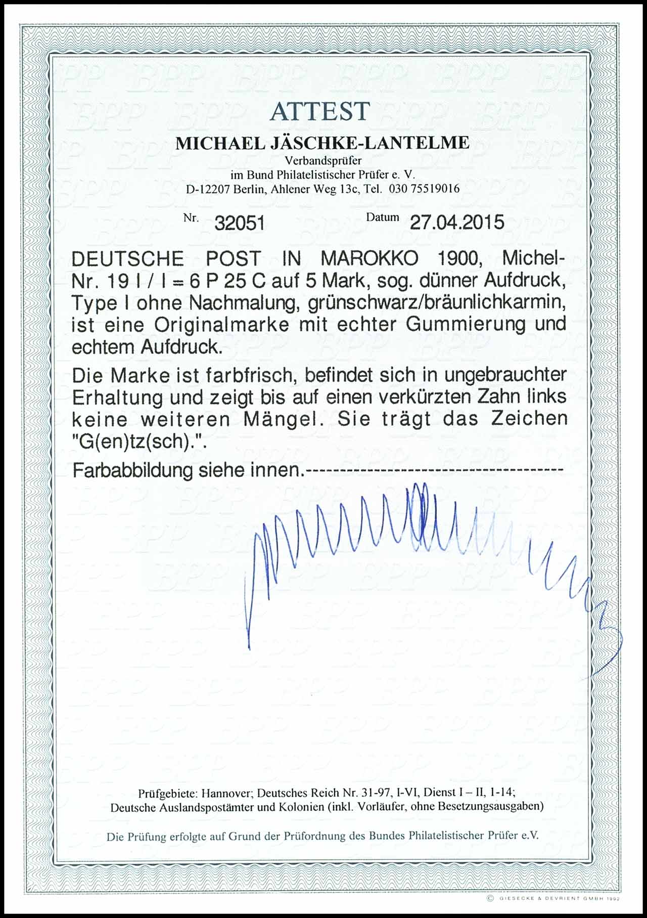 6 Pes. 25 cts. auf 5 Mark grünschwarz/bräunlichkarmin, Type I ohne Nachmalungen, ungebraucht, Fotoattest Jäschke-L. BPP "zeigt bis auf einen verkürzten Zahn links keine weiteren Mängel", Mi. 1.300.-