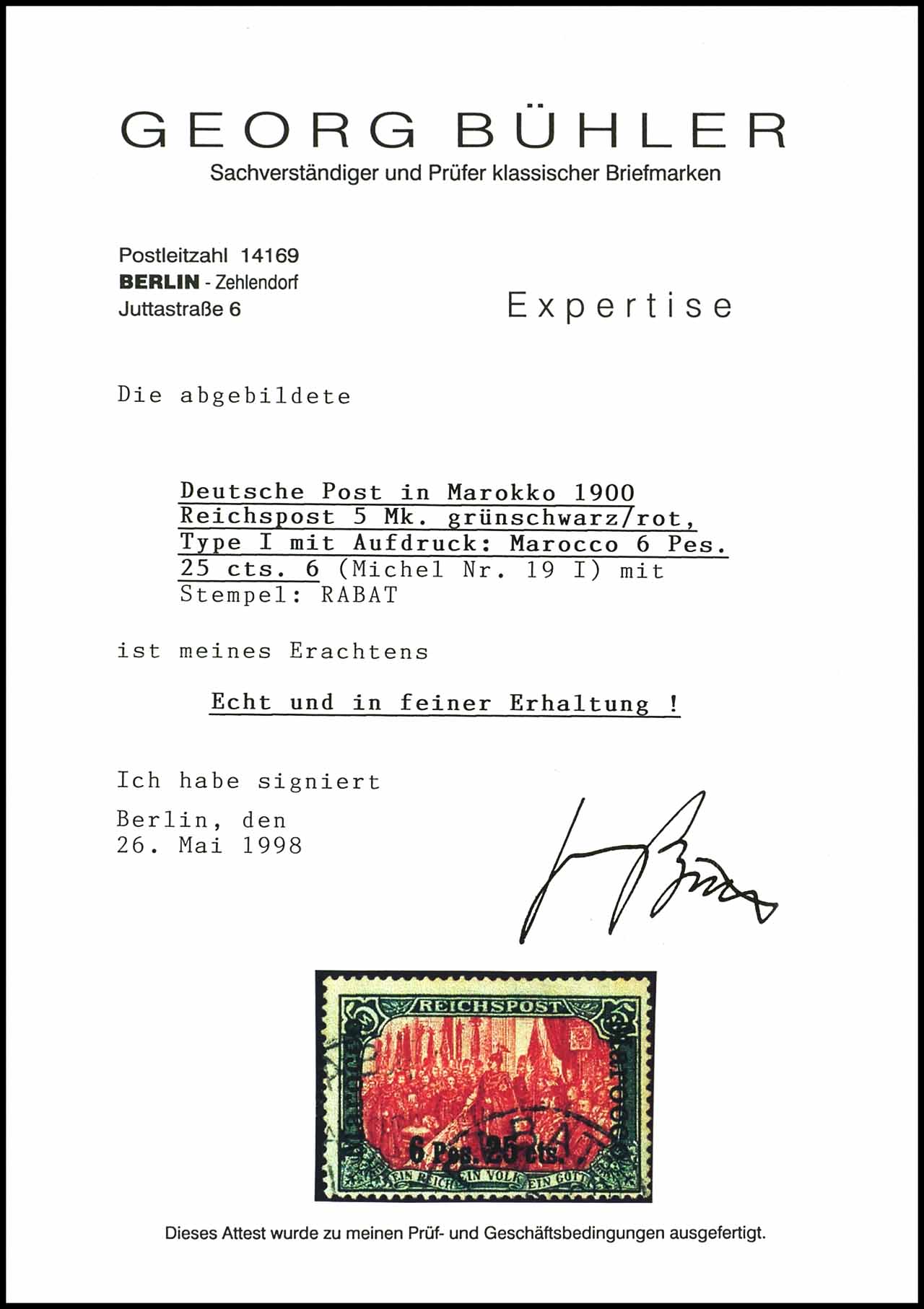 6 Pes.25 cts. auf 5 Mark grünschwarz/bräunlichkarmin, Urmarke Type I, ohne Nachmalungen, gestempelt, tadellose Erhaltung, Expertise Georg Bühler "echt und in feiner Erhaltung", Mi. 1.800.-