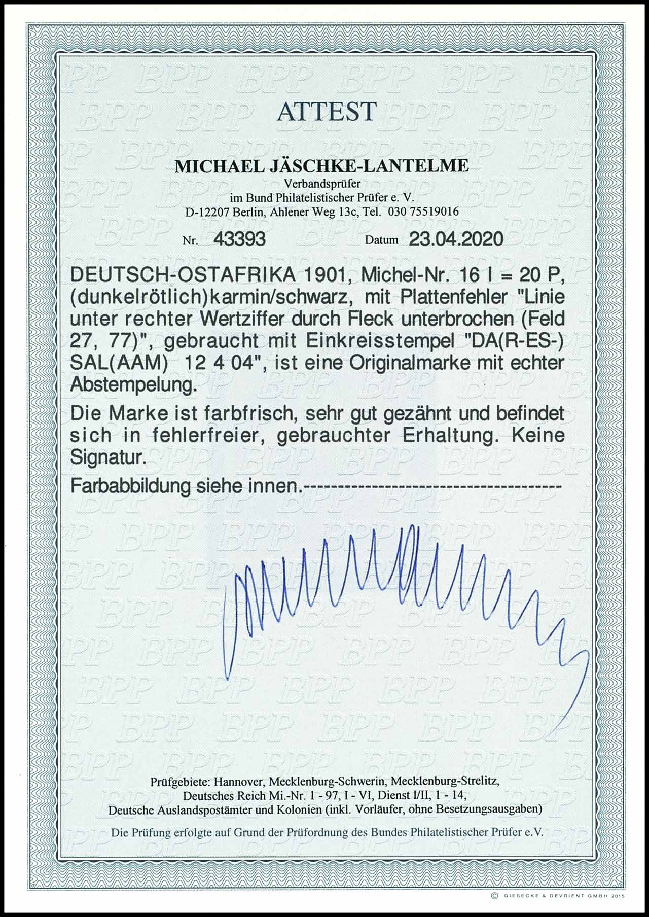 20 Pesa, (dunkelrötlich)karmin/schwarz, Plattenfehler "Linie unter rechter Wertziffer durch Fleck unterbrochen", gestempelt, tadellose Erhaltung, Fotoattest Jäschke-L. BPP "in fehlerfreier, gebrauchter Erhaltung", Mi. 500.-