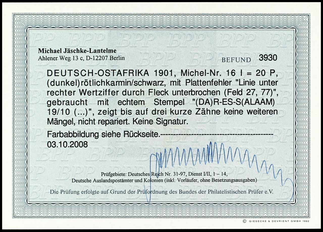 20 Pesa, rotkarmin/schwarz, Plattenfehler "Linie unter rechter Wertziffer durch Fleck unterbrochen", gestempelt Fotobefund Jäschke-L. BPP "zeigt bis auf drei kurze Zähne keine weiteren Mängel", Mi. 500.-