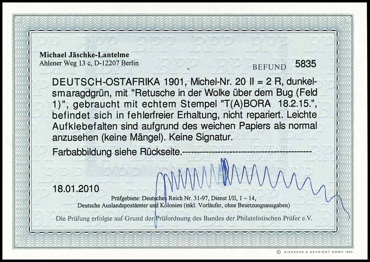 2 Rupien, dunkelsmaragdgrün, Plattenfehler "Retusche in der Wolke über dem Bug", gestempelt, tadellose Erhaltung, Fotobefund Jäschke-L. BPP "in fehlerfreier Erhaltung", Mi. 300.-