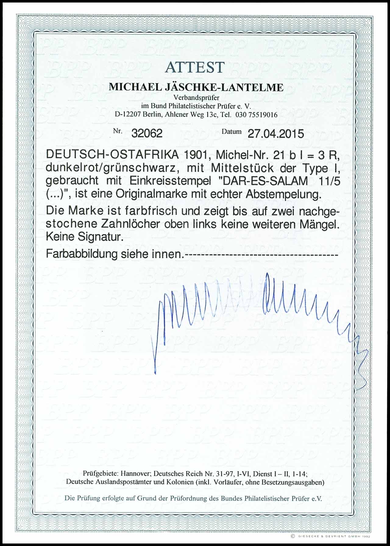 3 Rupien dunkelrot/grünschwarz, Mittelstück der Type 1, gestempelt, Fotoattest Jäschke-L. BPP " zeigt bis auf zwei nachgestochene Zahnlöcher keine weiteren Mängel", Mi. 1.500.-