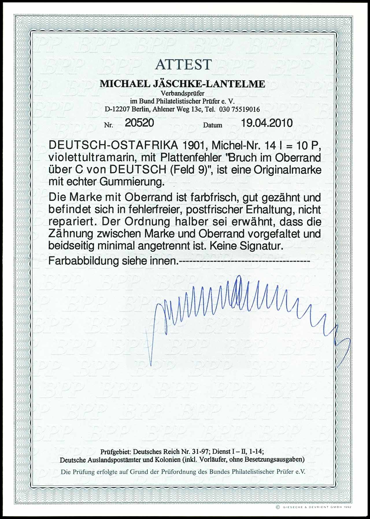 10 Pesa Kaiseryacht mit Plattenfehler I "Bruch im Oberrand über C von DEUTSCH", postfrisches Oberrandstück, Oberrand minimal angetrennt, ohne Signatur, tadellose Erhaltung, Fotoattest Michael Jäschke-Lantelme BPP "in fehlerfreier, postfrischer Erhaltung", Mi. 1.300.-