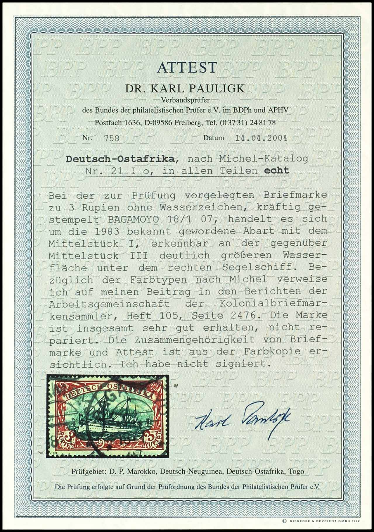 3 Rupien Kaiseryacht, dunkelrot/grünschwarz, Rahmenzeichnung Type III und Mittelstück Type I, gestempelt, tadellose Erhaltung, Fotoattest Dr. Pauligk BPP "die Marke ist sehr gut erhalten", Mi. 1.500.-