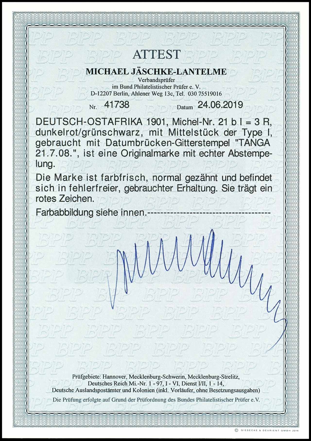 3 Rupien Kaiseryacht, dunkelrot/grünschwarz, Rahmenzeichnung Type III und Mittelstück Type I, gestempelt, tadellose Erhaltung, Fotoattest Michael Jäschke-Lantelme BPP "in fehlerfreier, gebrauchter Erhaltung", Mi. 1.500.-