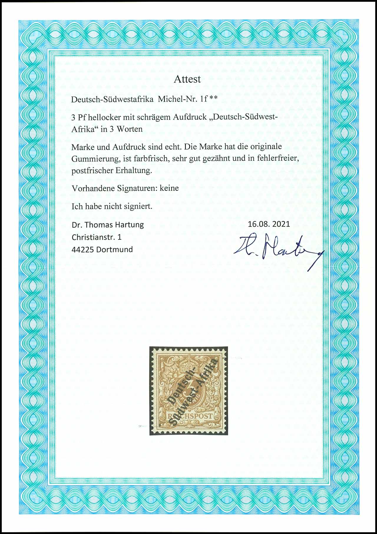 3 Pfennig Krone/Adler hellocker mit schwarzem Bdr.-Aufdruck "Deutsch-Südwest-Afrika", tadellos postfrisch und noch unsigniert, Fotoattest Dr. Hartung: "sehr gut gezähnt und in fehlerfreier, postfrischer Erhaltung." Mi. 900.-