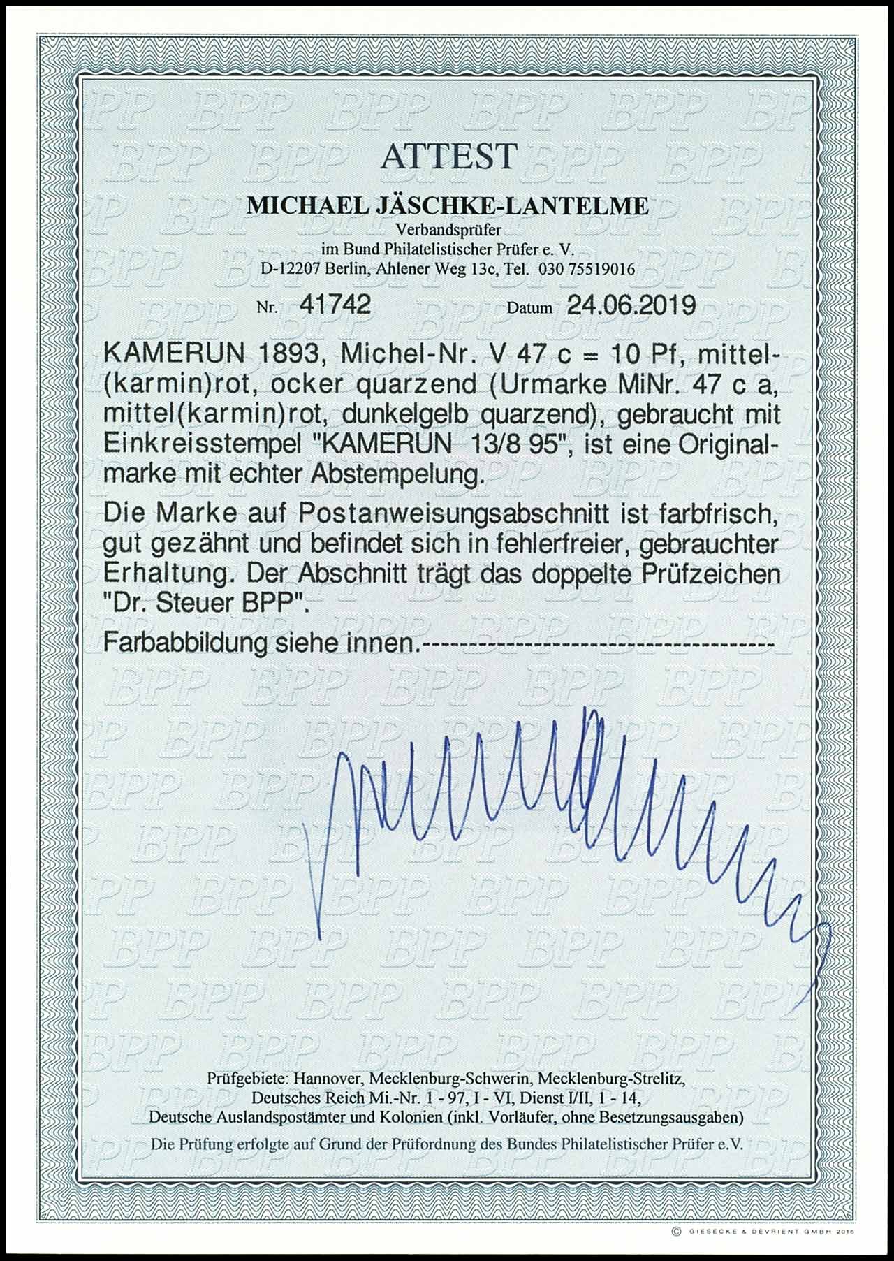 10 Pfennig Krone/Adler mittelkarminrot (UV ocker quarzend - Urmarke MiNr. 47 ca), entwertet mit Einkreisstempel "KAMERUN 13/8 95" auf Postanweisungsabschnitt, tadellose Erhaltung, geprüft Dr. Steuer BPP, Fotoattest Michael Jäschke-Lantelme BPP (2019) "in fehlerfreier, gebrauchter Erhaltung."