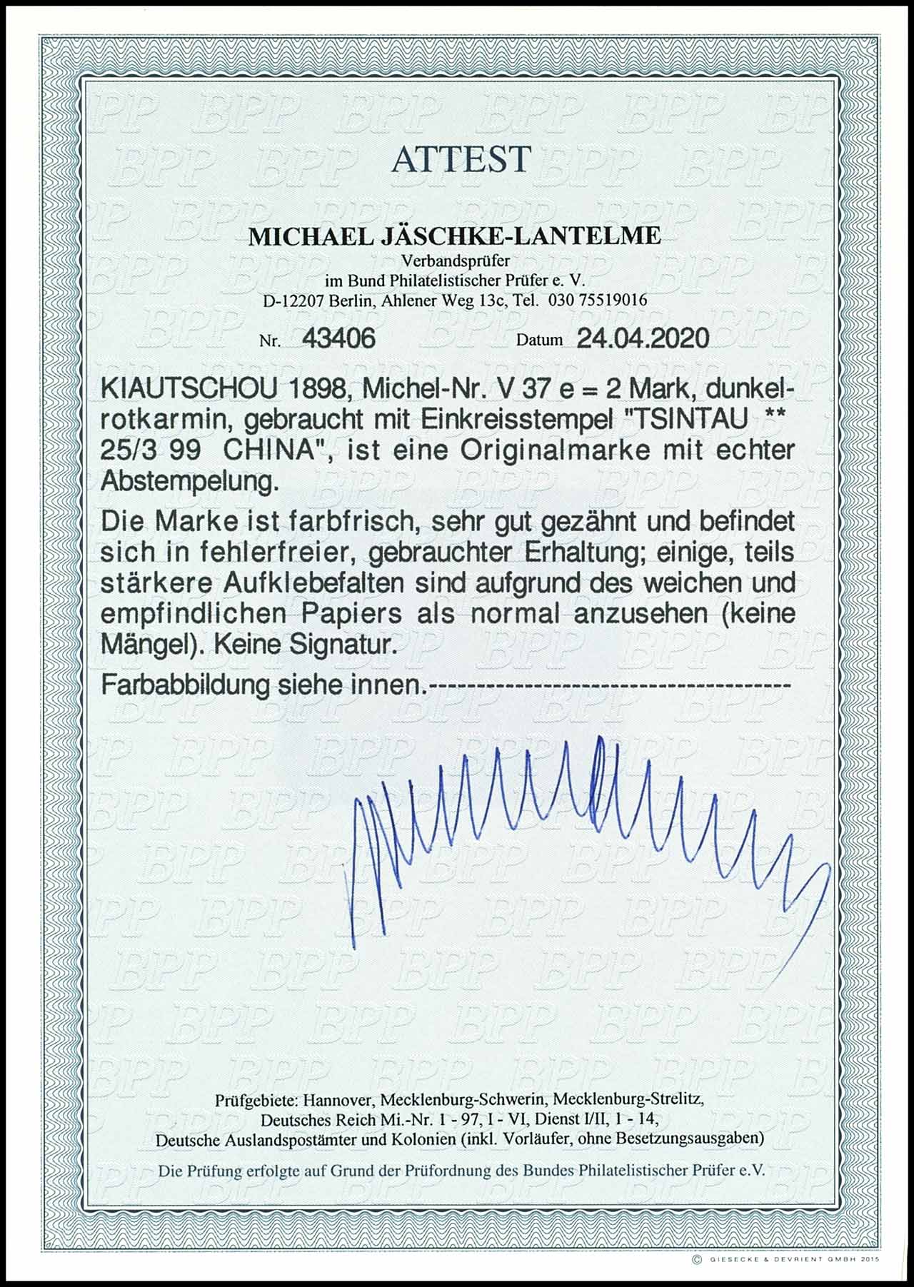 2 Mark dunkelrotkarmin, entwertet mit Einkreisstempel "TSINGTAU * * 25 3 99 CHINA", tadellose Erhaltung mit Aufklebefalten die laut Attest keinen Mangel darstellen, sondern dem weichen Papier geschuldet sind, Fotoattest Michael Jäschke-Lantelme BPP