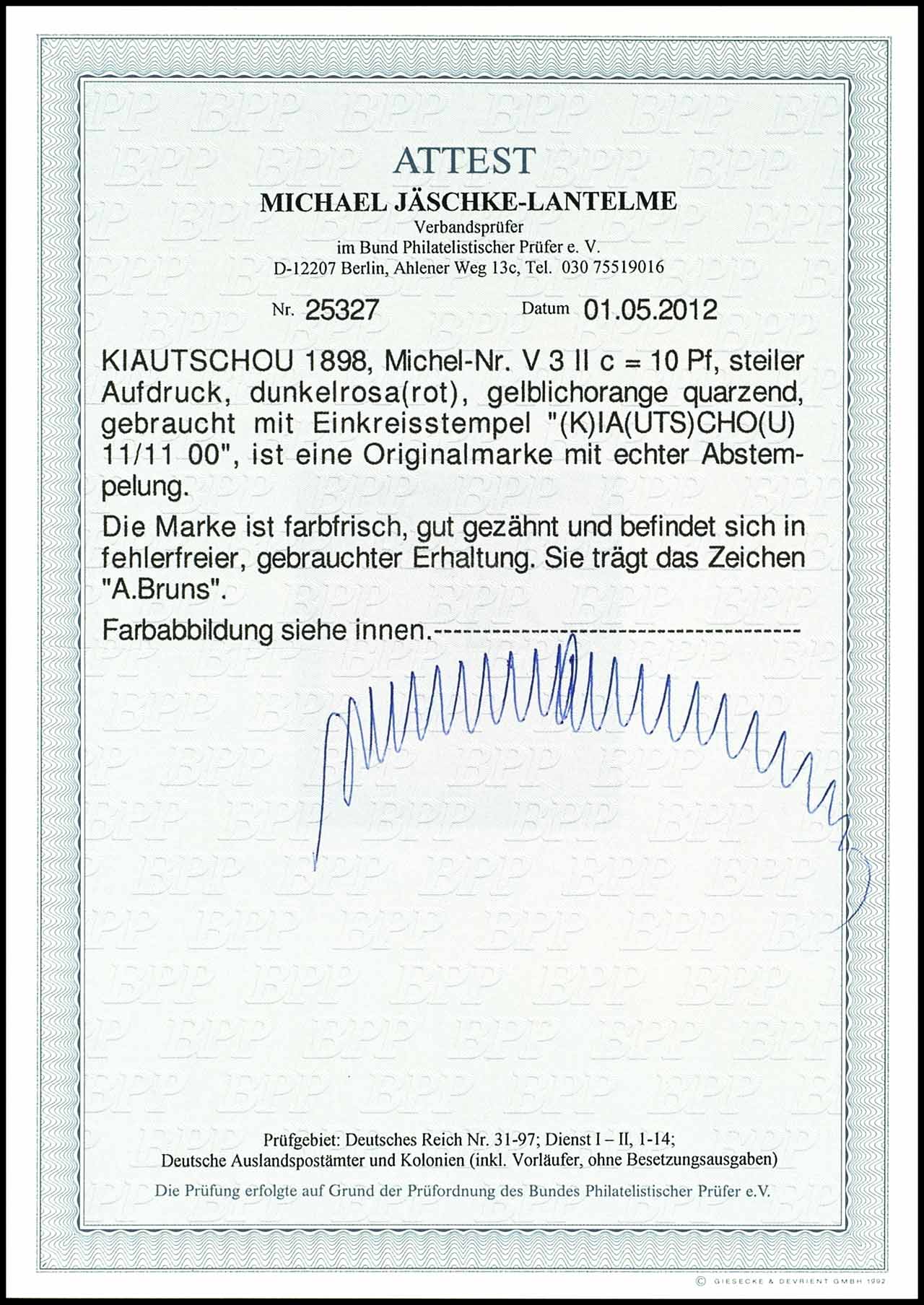 10 Pfennig Krone/Adler dunkelrosarot (gelblichorange quarzend) mit steilem Bdr.-Aufdruck "China", entwertet mit besserem Einkreisstempel "KIAUTSCHOU 11/11 00", tadellose Erhaltung, signiert A. Bruns, Fotoattest Michael Jäschke-Lantelme BPP "in fehlerfreier, gebrauchter Erhaltung."