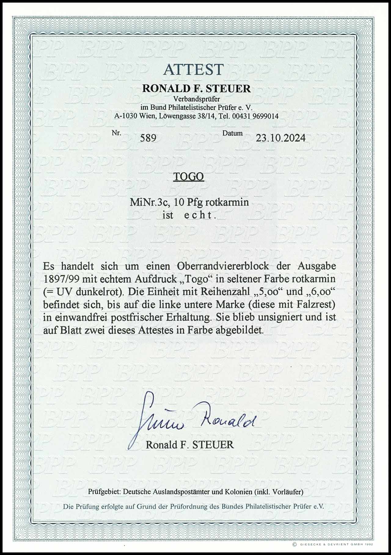 10 Pfennig Krone/Adler rotkarmin (UV dunkelrot), tadellos postfrisch vom Oberrand, noch unsigniert, Fotoattest Ronald F. Steuer BPP (für 4er-Block) "in einwandfrei postfrischer Erhaltung." Mi. 700.-