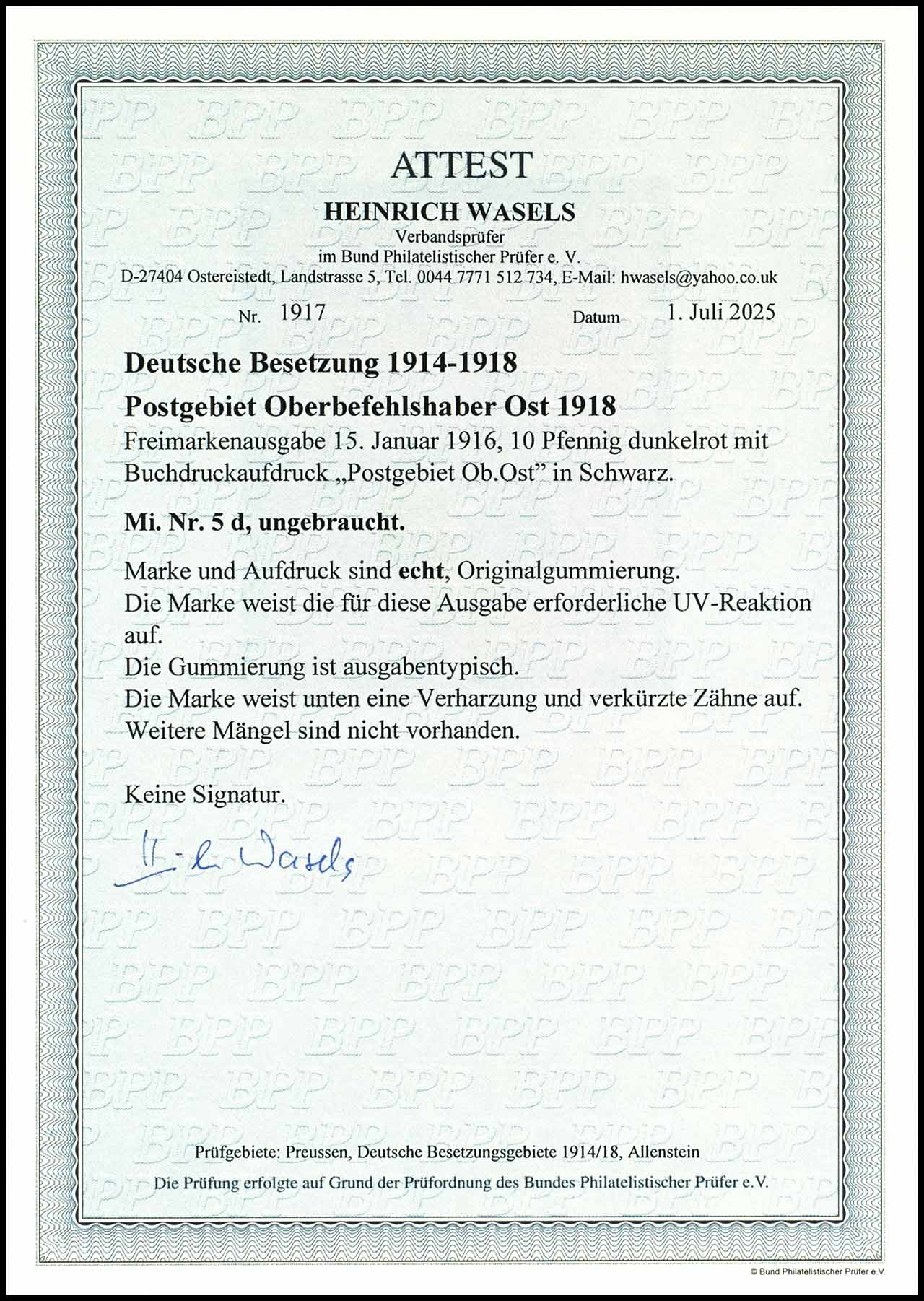 10 Pfennig Germania dunkelrot, zinnoberrot quarzend, ungebraucht mit Originalgummierung, unten Verharzung und verkürzte Zähne - sonst tadellose Erhaltung, unsigniert, Fotoattest Heinrich Wasels BPP (2025), Mi. 1.000.-