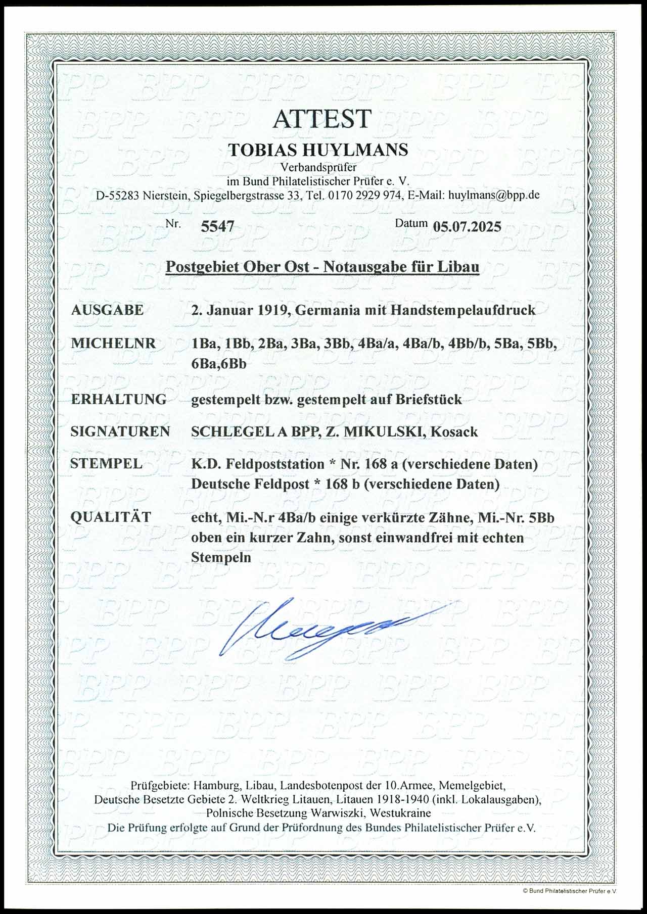 25 Pfennig Germania rotorange/schwarz auf gelbweiß mit violettblauem Aufdruck "LIBAU" in Type II, tadellos gestempelt "DEUTSCHE FELDPOST * 168 b 4.1.19" Auflage nur ca. 200 Stück, Fotoattest Tobias Huylmans BPP "echt und einwandfrei.", Mi. 650.-