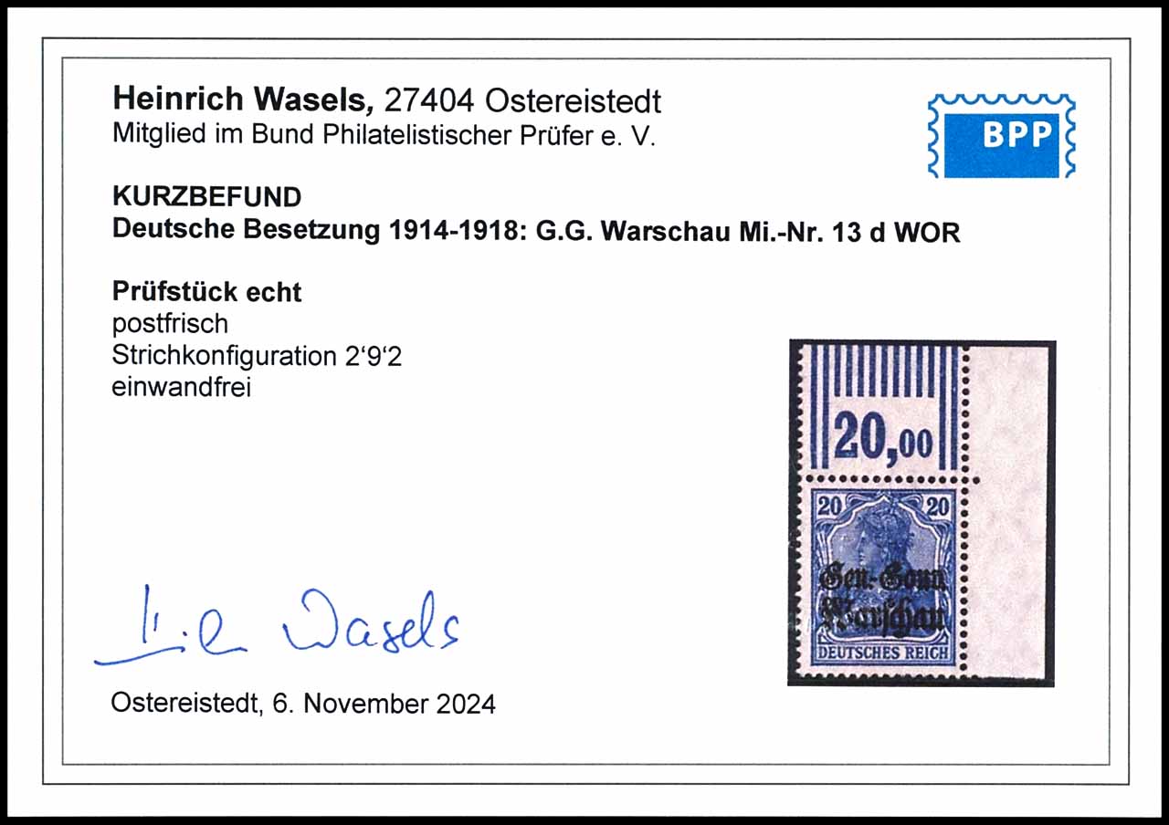 20 Pfennig Germania dunkelviolett, ungefaltete Walzendruck-Bogenecke rechts oben in Konfiguration 2`9`2, tadellos postfrisch in unsignierter Prachterhaltung, Fotobefund Wasels BPP "einwandfrei"