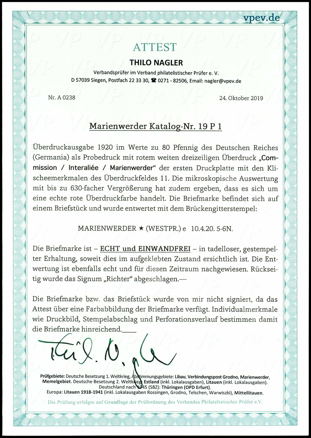 80 Pfennig Germania mit dreizeiligem roten Probeaufdruck, erste Druckplatte - Feld 11, entwertet "MARIENWERDER * (WESTPR.) e 10.4.20 5-6N" auf Briefstück, tadellose Erhaltung, signiert Richter, Fotoattest Thilo Nagler VP "echt und einwandfrei"