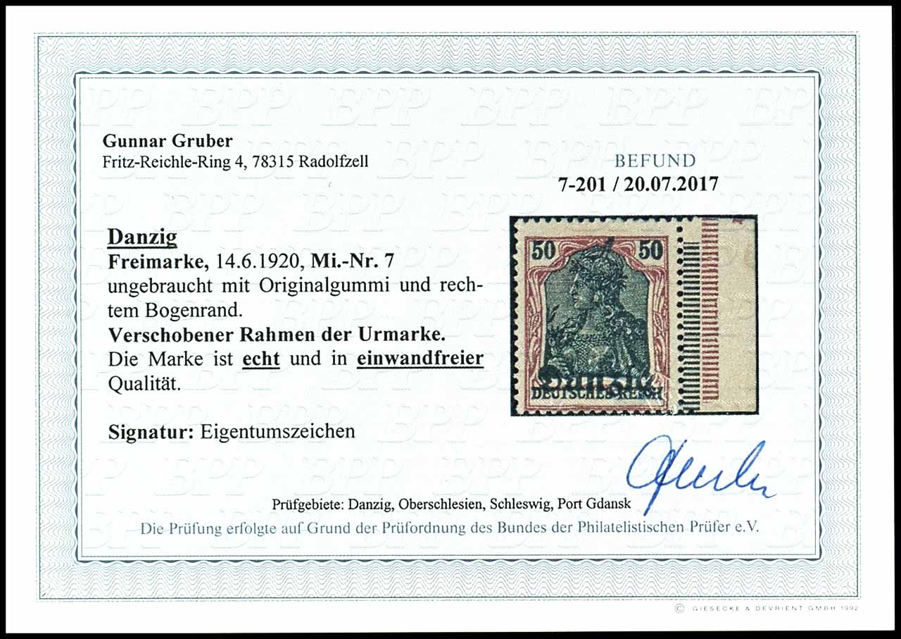 50 Pfennig Freimarke mit Aufdruck Danzig in schwarz vom rechten Bogenrand, mit stark verschobenem Rahmen der Urmarke, ungebraucht mit Originalgummi, Besitzerzeichen, Fotobefund Gunnar Gruber (2017) "echt und einwandfrei"