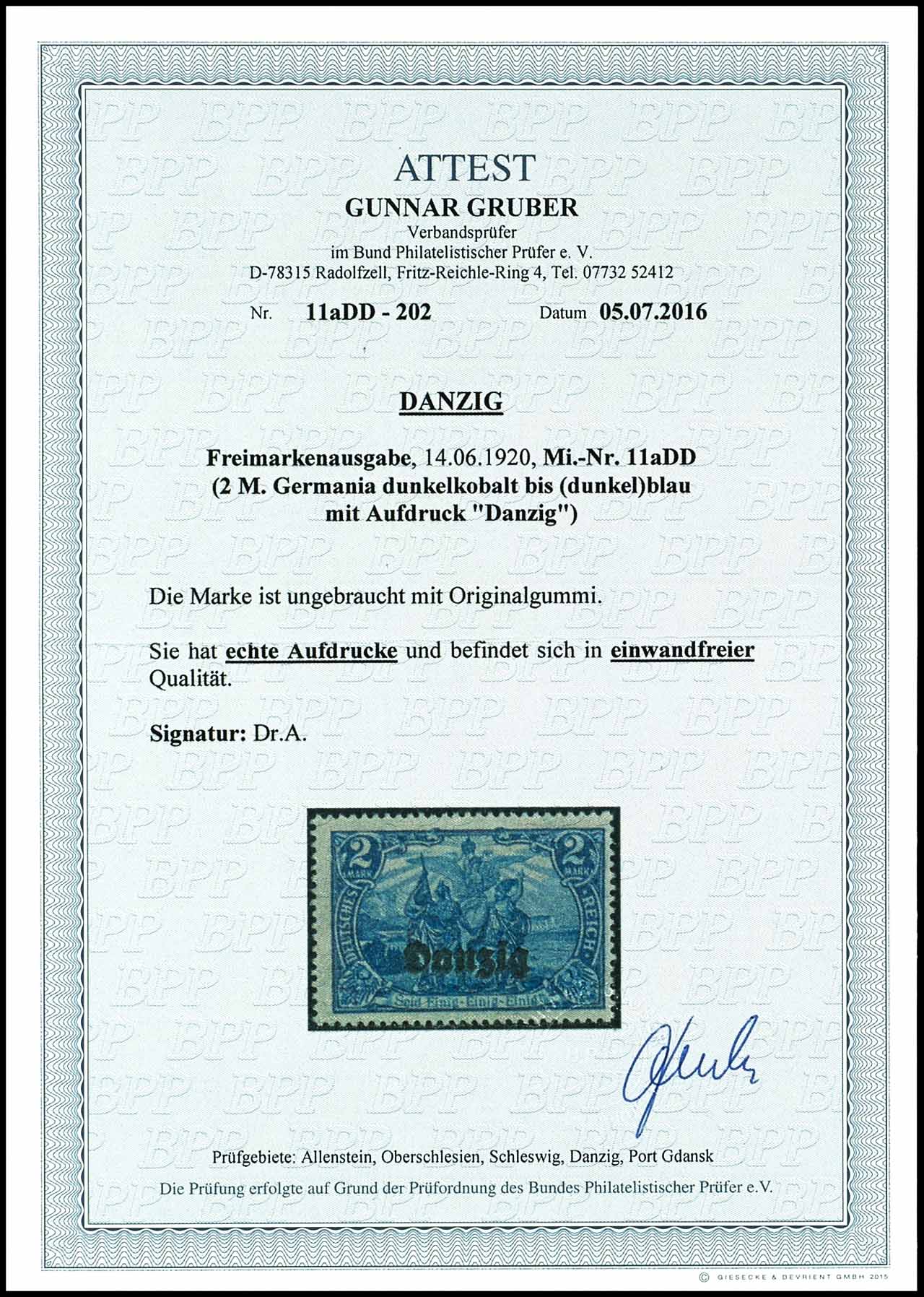 2 Mark dunkelblau mit Aufdruck "Danzig", Abart "doppelter Aufdruck, ungebraucht mit Originalgummierung, tadellose Erhaltung, Fotoattest Gunnar Gruber BPP "in einwandfreier Qualität.", Mi. 450.-