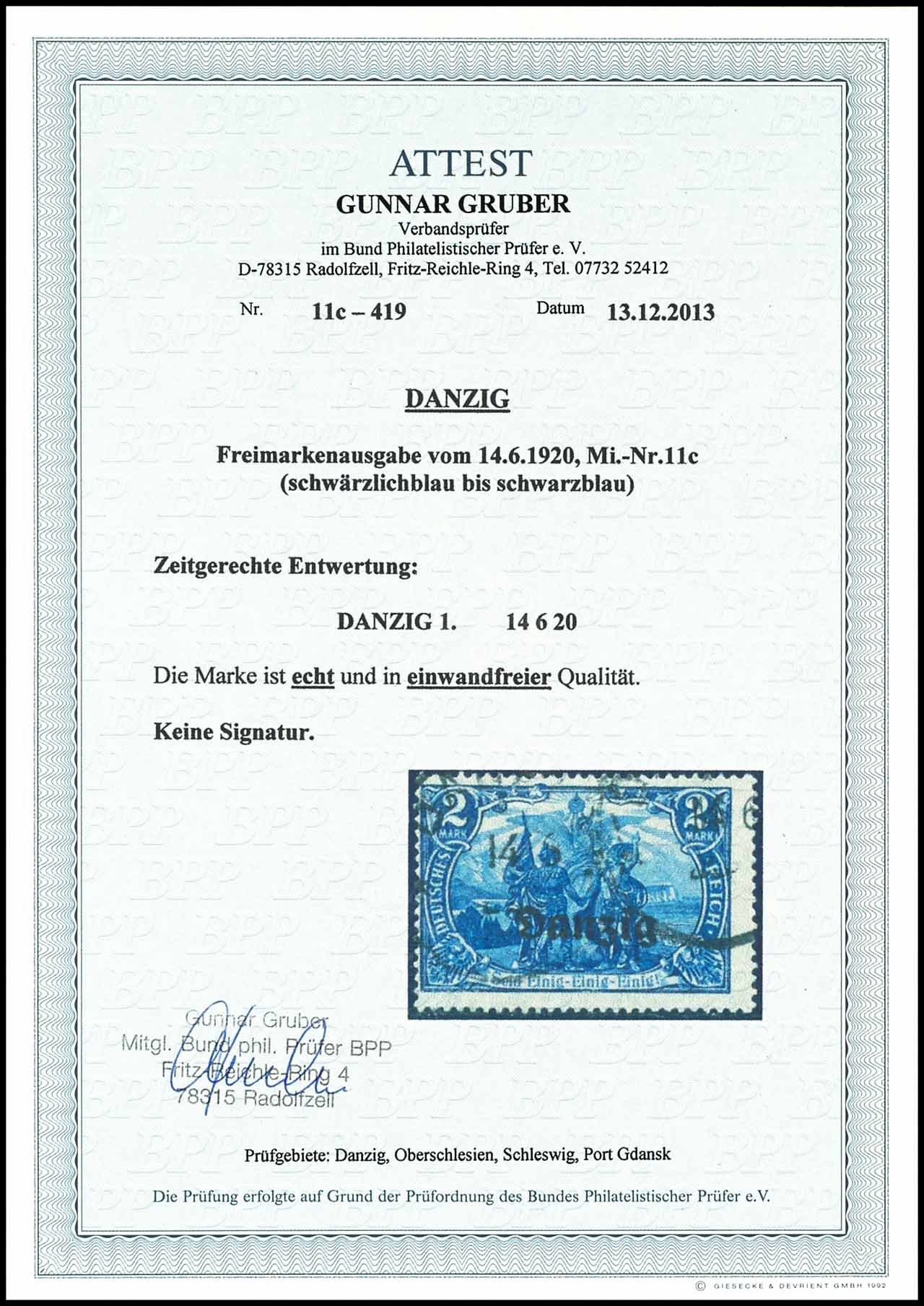 2 Mark Deutsches Reich mit Buchdruck-Aufdruck "Danzig", schwärzlichblau, seltene Farbvariante, gestempelt, zeitgerecht "DANZIG 1. 14 6 20", tadellose Erhaltung, Fotoattest Gunnar Gruber BPP (2013), "echt und einwandfrei", Mi. 1.800.-