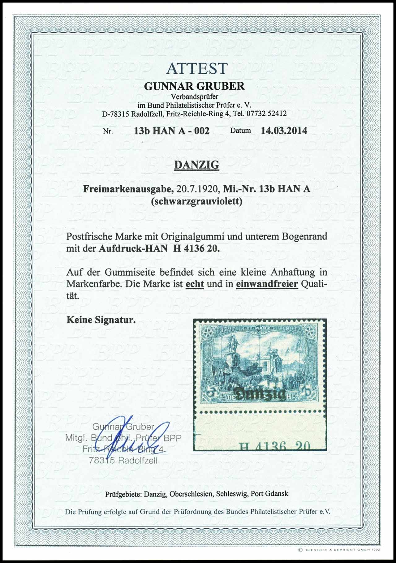 3 Mark mit Aufdruck "Danzig", schwarzgrauviolett, Unterrandstück mit Aufdruck-Hausauftragsnummer H 4136.20, postfrisch, kleine Anhaftung in Markenfarbe (herstellungsbedingt), tadellose Erhaltung, Fotoattest Gunnar Gruber BPP "Die Marke ist echt und in einwandfreier Qualität."