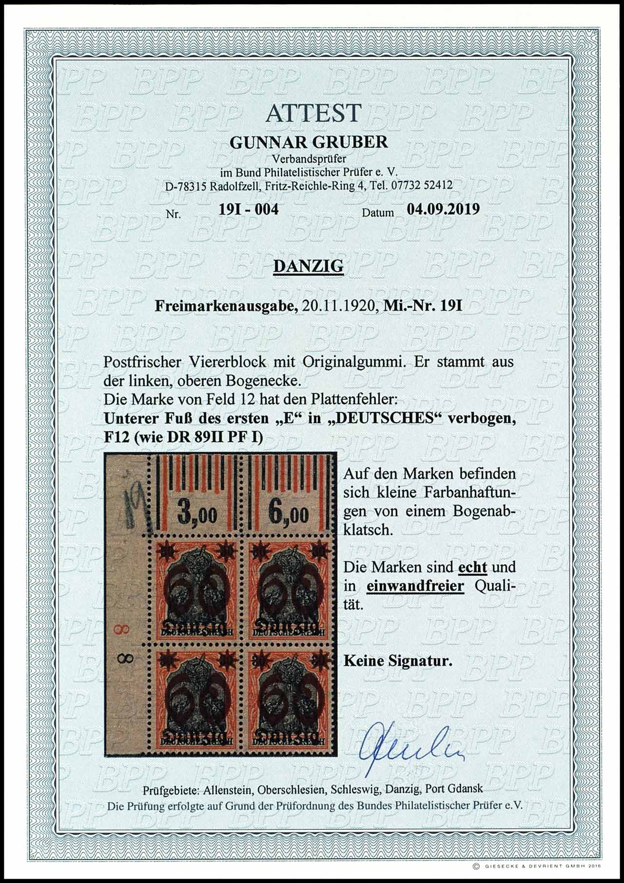 60 Pfennig auf 30 Pfennig Germania, linker oberer Eckrandviererblock im Rotations-(Walzen)druck, rechte untere Marke mit PF I "unterer Fuß des ersten e in Deutsches verbogen (Feld12)", wie DR 89 II PF I, postfrisch, kleine Anhaftungen von einem Bogenabklatsch, Fotoattest Gunnar Gruber BPP (2019) "echt und einwandfrei", Mi. 300.-