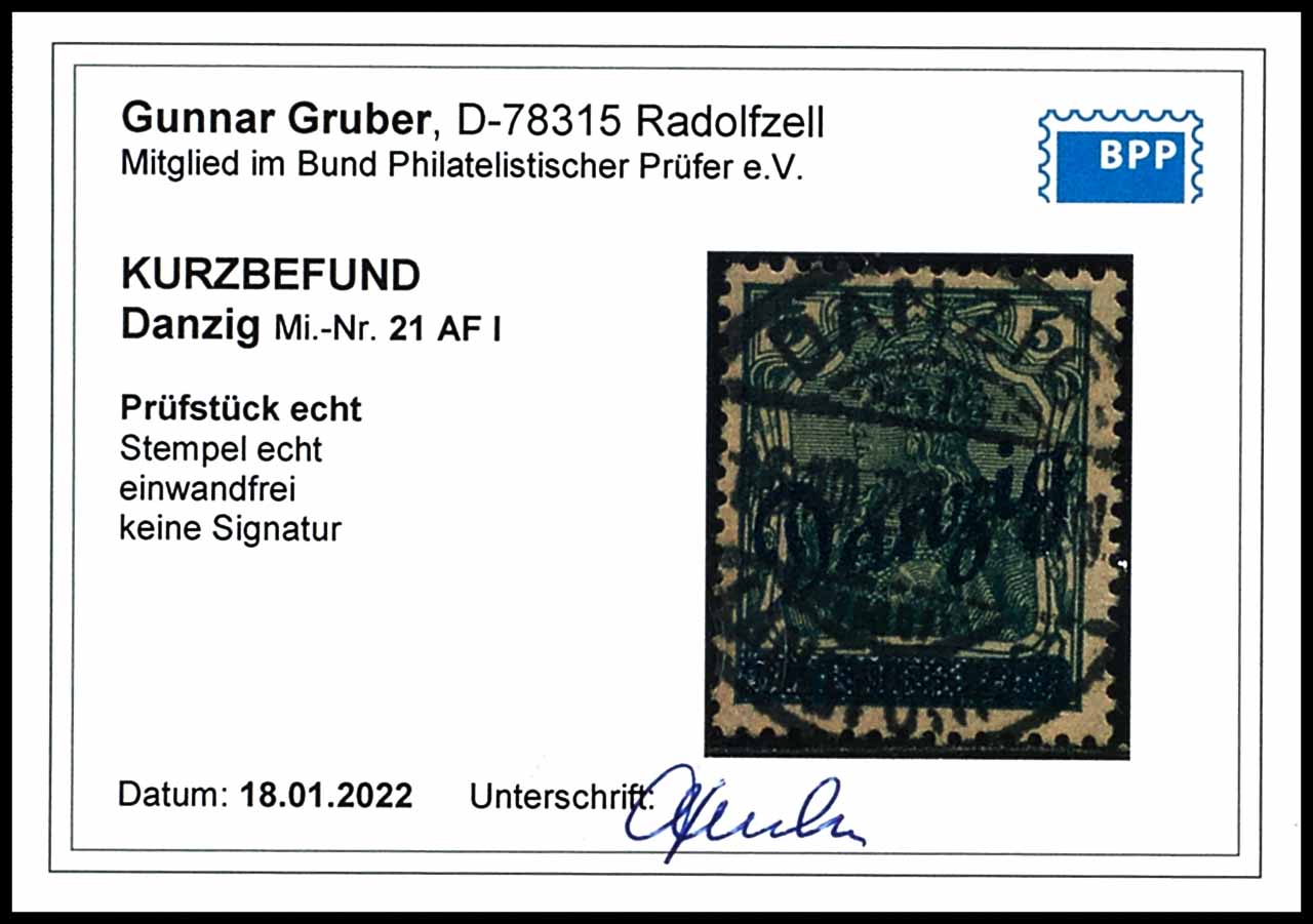 5 Pfennig Germania mit blauem Aufdruck Danzig "sogenannter Schrägaufdruck", mit Aufdruckfehler I "Aufdruck Denzig "e" statt "a",Platten 1,4, und 5, Feld 88)", zentrisch gestempelt, tadellose Erhaltung, Fotobefund Gunnar Gruber BPP "Stempel echt, einwandfrei", Mi. 200.-
