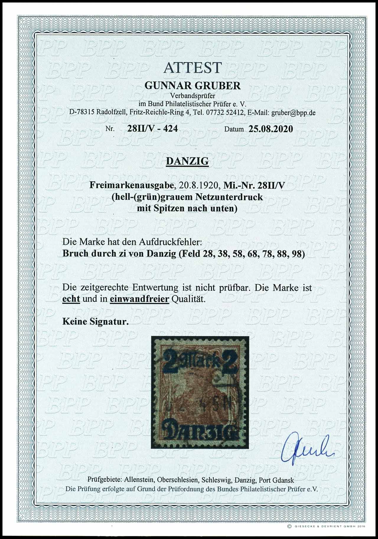 2 Mark auf 35 Pfennig mit Netzunterdruck, hell-(grün)grau, Spitzen nach unten, mit Aufdruckfehler AFI: "Bruch durch "zi" von Danzig", tadellose Erhaltung, geprüft Oechsner BPP, Richter und ein Besitzerzeichen, Attest Gunnar Gruber BPP (2020) "echt und einwandfrei", Mi. 600.-