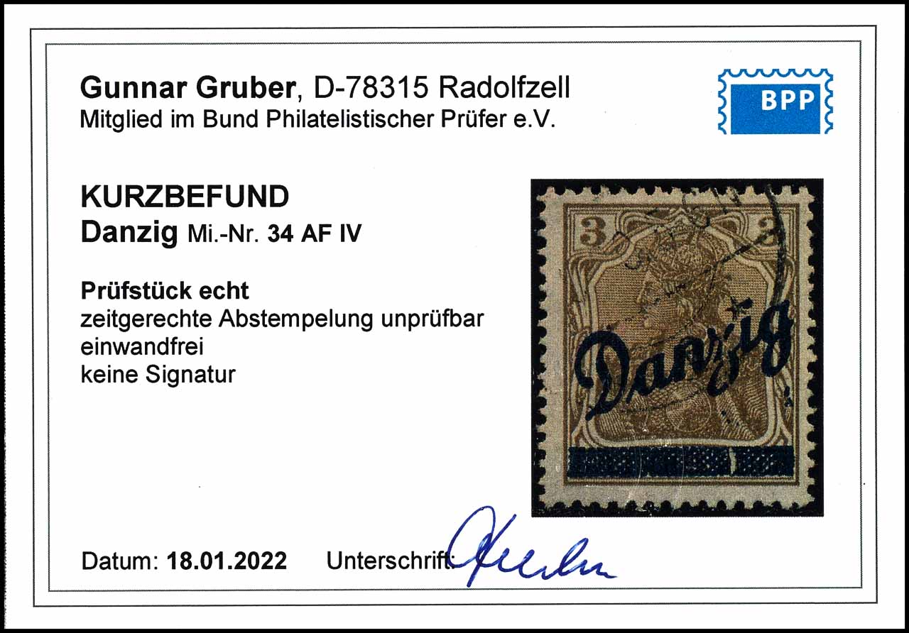 3 Pfennig Germania mit blauem Aufdruck Danzig "kleiner Innendienst", mit Aufdruckfehler IV ""z" in Danzig senkrecht gebrochen sowie Aufdruckbalken senkrecht geteilt, Klischeenagelabdruck unter "g" (Platte1, Feld22)", gestempelt, tadellose Erhaltung, Fotobefund Gunnar Gruber BPP (2022) "echt und einwandfrei", Mi. 50.-