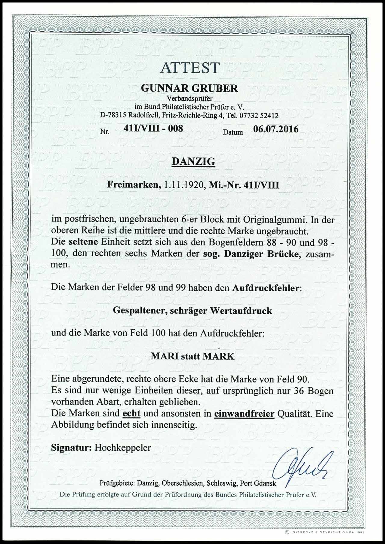 1 Mark auf 30 Pfennig Germania, Sechserblock von den Feldern 88-90 und 98-100 - dabei Aufdruckfehler auf den Feldern 98 und 99 "gespaltener schräger Wertaufdruck" sowie Feld 100 mit Aufdruckfehler "MARI statt Mark", die Feld 89/90 ungebraucht sonst postfrische Einheit, Feld 90 rechte obere Ecke abgerundet, nur wenige Einheiten dieser seltenen Abart die nur auf 36 Bogen vorkommt sind erhalten geblieben, geprüft Hochkeppeler, Fotoattest Gunnar Gruber BPP "ansonsten in einwandfreier Qualität.", Mi. 3.000.-