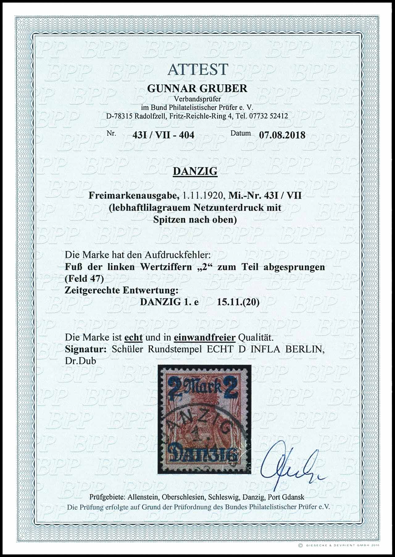 2 Mark auf 35 Pfennig Germania, lebhaftlilagrauer Netzunterdruck mit Spitzen nach oben, Aufdruckfehler IV "Fuß der linken Wertziffer 2 zum Teil abgesprungen" (Feld 47), zeitgerecht entwertet "DANZIG 1. e 15.11.(20)", tadellose Erhaltung, geprüft Schüler, Dr. Dub und Fotoattest Gunnar Gruber BPP "in einwandfreier Qualität."