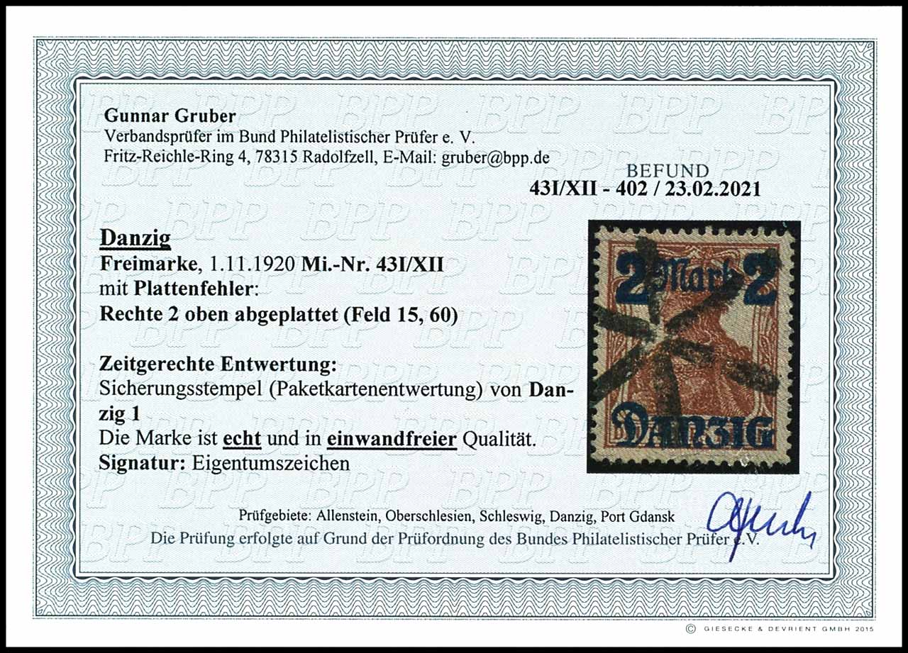 2 Mark auf 35 Pfennig mit Netzunterdruck, hell-(grün)grau, Spitzen nach oben, mit Aufdruckfehler AFVIII: "Rechte 2 oben abgeplattet", Feld 15 und Feld 60", zeitgerechte Entwertung Sicherungsstempel (Paketkartenentwertung) von Danzig 1, tadellose Erhaltung, Eigentümerzeichen, Fotobefund Gunnar Gruber BPP (2021) "echt und einwandfrei", Mi. 450,-