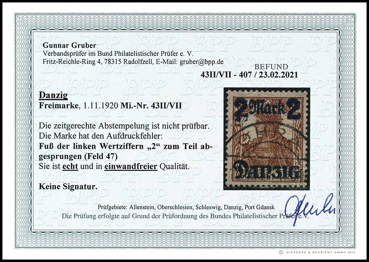 2 Mark auf 35 Pfennig mit Netzunterdruck, lebhaftlilagrau, Spitzen nach unten, mit Aufdruckfehler IV "Fuß der linken "2" zum Teil abgesprungen, Feld 47", zeitgerechte Entwertung nicht prüfbar, tadellose Erhaltung, Fotobefund Gunnar Gruber BPP (2021) "echt und einwandfrei", Mi. 400.-