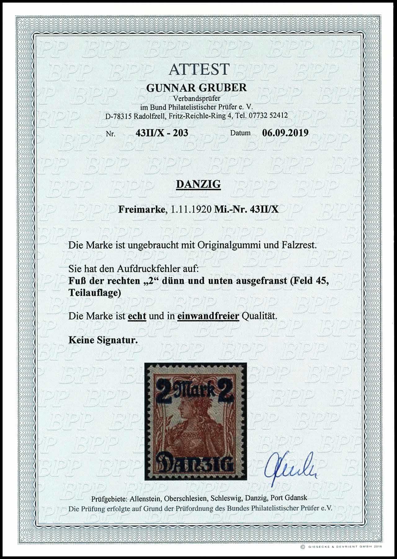 2 Mark auf 35 Pfennig mit Netzunterdruck, lebhaftlilagrau, Spitzen nach unten, mit Aufdruckfehler VI "Fuß der rechten "2" dünn und unten ausgefranst, Feld 45, Teilauflage", ungebraucht mit Originalgummi und Falzrest, tadellose Erhaltung, Attest Gunnar Gruber BPP "echt und einwandfrei", Mi. 300.-