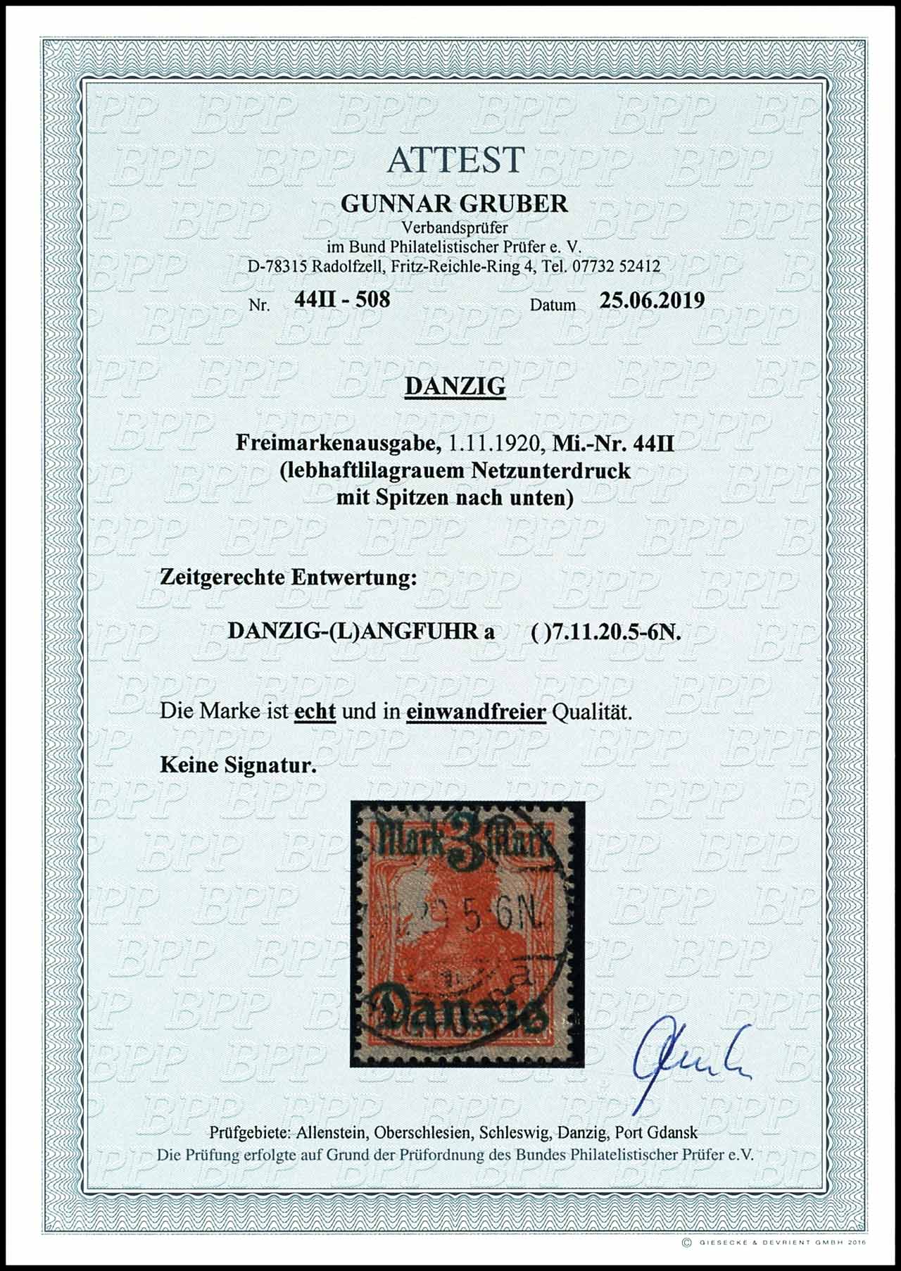 3 Mark auf 7 1/2 Pfennig, zeitgerecht entwertet "DANZIG-(L)angfuhr 7.11.20 5-6N", tadellose Erhaltung, Attest Gunnar Gruber BPP "echt und einwandfrei", Mi. 500.-