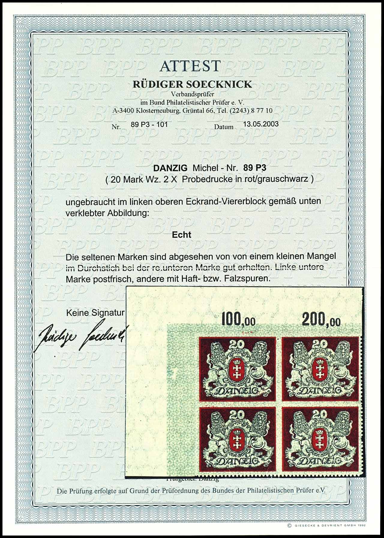 20 Mark Staatswappen, Probedruck in rot/grauschwarz, ungebraucht mit Originalgummierung, tadellose Erhaltung, Fotoattest Rüdiger Soecknick BPP (für ehemalige Einheit)