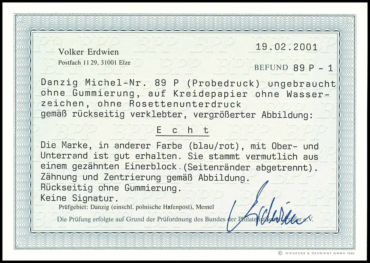 20 Mark Stattsappen, Probedruck blau/rot auf Kreidepapier ohne Wasserzeichen und Rosettenunterdruck, ungebraucht ohne Gummierung, vermutlich aus Einzelabzug stammend (Seitenränder abgetrennt), Fotobefund Volker Erdwien BPP