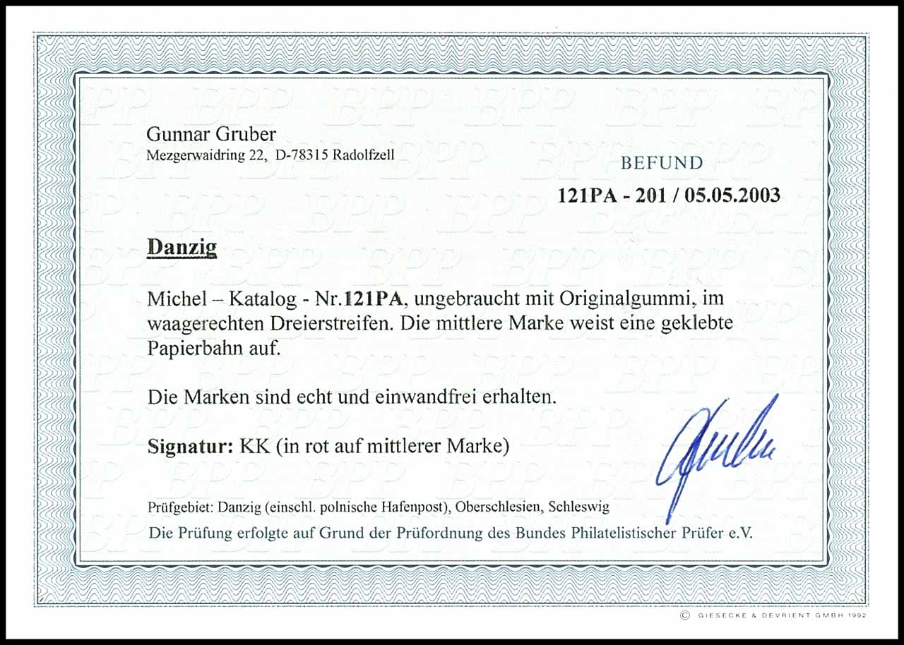 1000 Mark Staatswappen, Abart "geklebte Papierbahn", waagerechter Dreierstreifen bei dem die mittlere Marke die Abart zeigt, ungebraucht mit Originalgummierung, tadellose Erhaltung, Fotobefund Gunnar Gruber BPP "einwandfrei erhalten."
