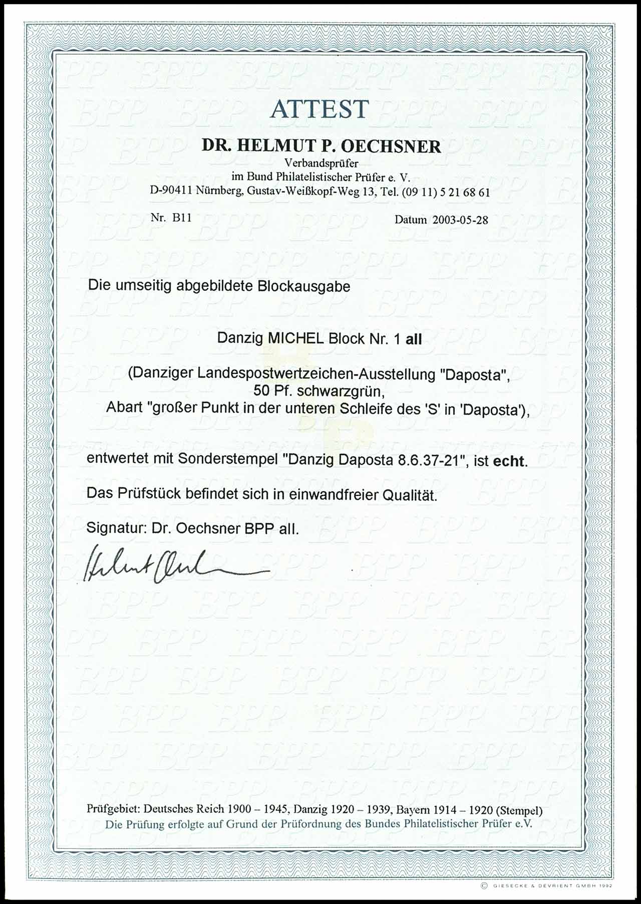 Blockausgabe "Danziger Landespostwertzeichen-Ausstellung DAPOSTA", Plattenfehler II "großer Punkt in der unteren Schleife des S in DAPOSTA", entwertet mit Sonderstempel "Danzig Daposta 8.6.37-21", tadellose Erhaltung, geprüft Oechsner BPP, Fotoattest Dr. Helmut P. Oechsner BPP "in einwandfreier Qualität."