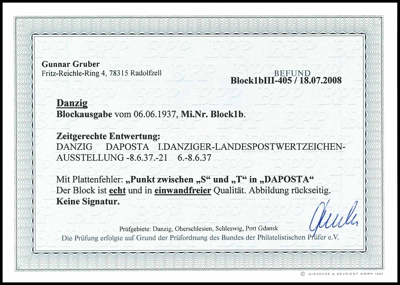 Blockausgabe "Danziger Landespostwertzeichen-Ausstellung DAPOSTA", Plattenfehler III "Punkt zwischen S und T in DAPOSTA", entwertet mit Sonderstempel "Danzig Daposta 8.6.37-21", tadellose Erhaltung, Fotobefund Gunnar Gruber BPP "in einwandfreier Qualität."