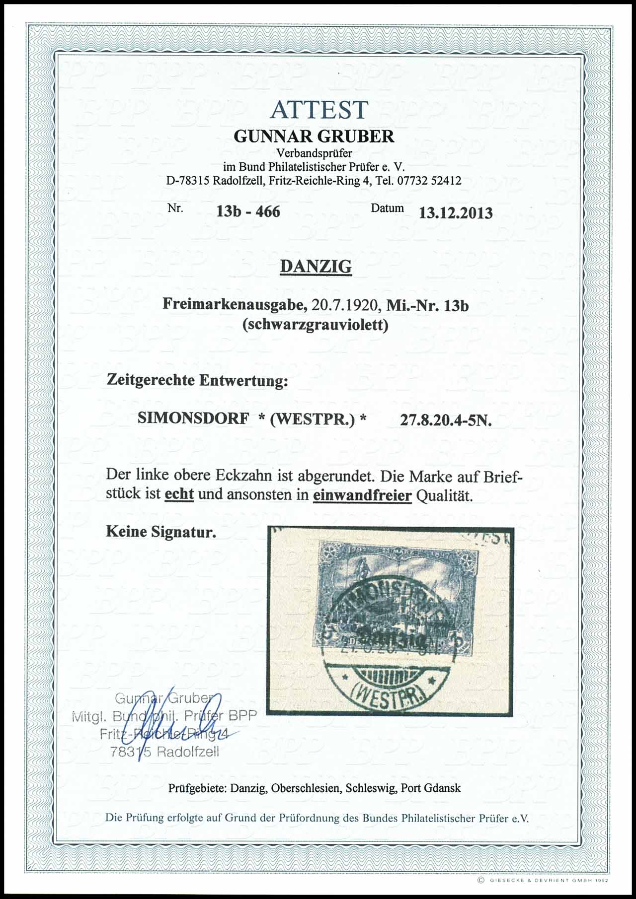 3 Mark Deutsches Reich mit Buchdruck-Aufdruck "Danzig", schwarzgrauviolett auf kleinem Briefstück, zeitgerechte Entwertung "SIMONSDORF * (WESTPR.) 27.8.20 4-5N", linker oberer Eckzahn abgerundet, unsigniert, Fotoattest Gunnar Gruber BPP (2013), Mi. 1.200.-
