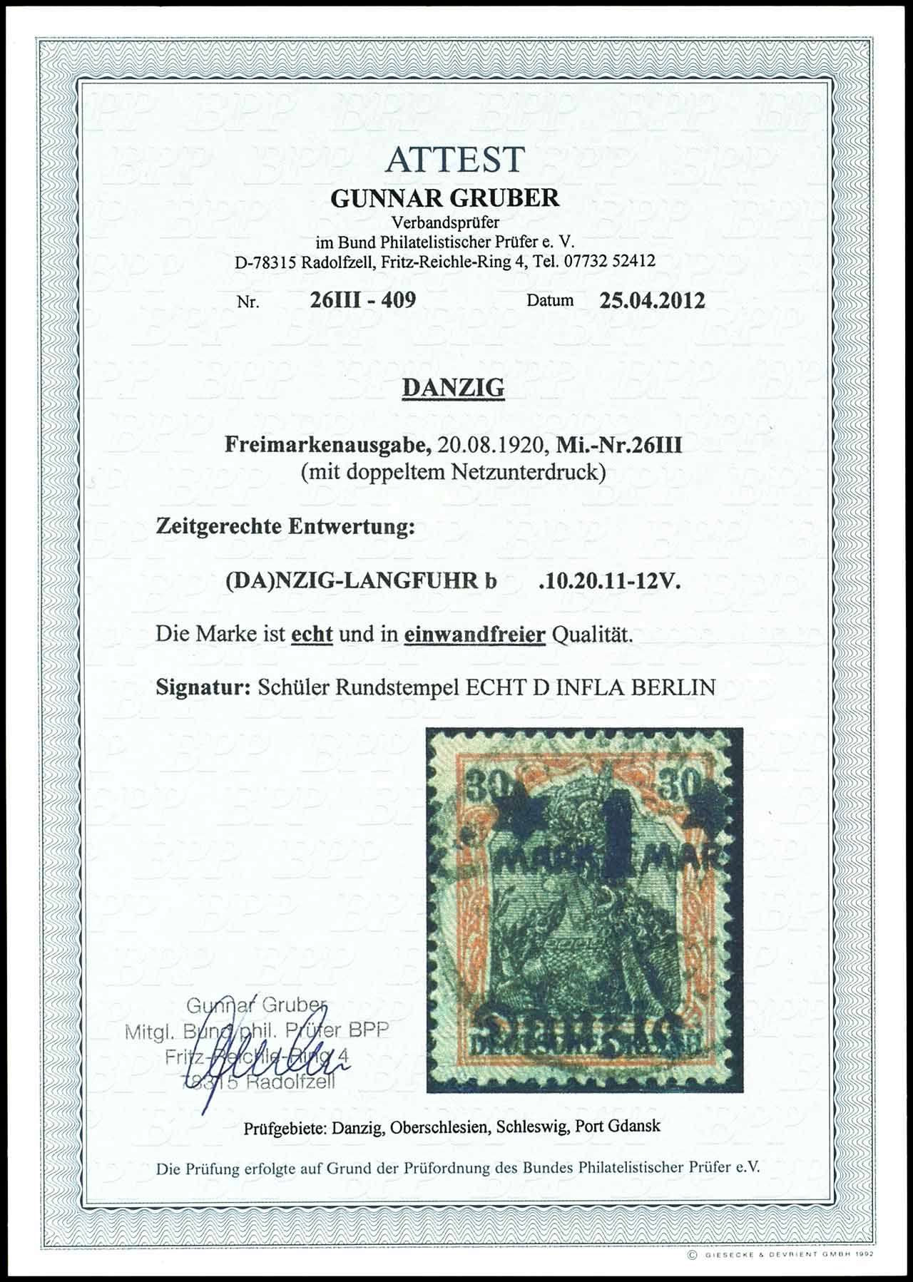 1 Mark auf 30 Pfennig Germania, Unterdruck mit Spitzen nach oben, Abart "doppelter Unterdruck", zeitgerecht entwertet "DANZIG-LANGFUHR b ...10.20 11-12V", tadellose Erhaltung, Fotoattest Gunnar Gruber BPP "in einwandfreier Qualität.", Mi. 1.000.-