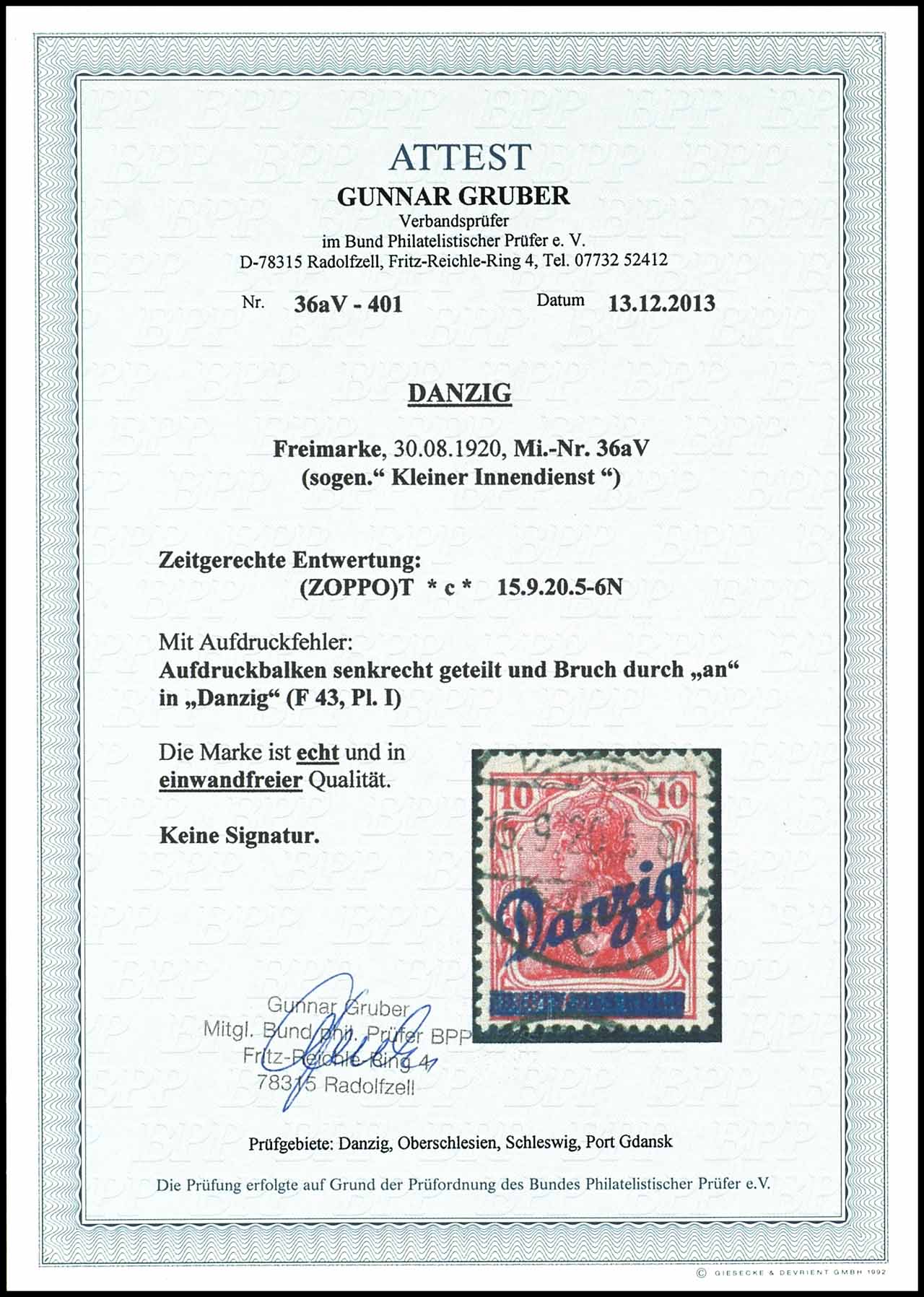 10 Pfennig Germania, "Kleiner Innendienst", dunkelrosarot, Aufdruckfehler III "Aufdruckbalken senkrecht geteilt und Bruch durch "an" in "Danzig", Bogenfeld 43, Platte1", zeitgerecht entwertet "(ZOPPO)T * c * 15.9.20. 5-6N", tadellose Erhaltung , unsigniert, Fotoattest Gunnar Gruber BPP "echt und einwandfrei", Mi. -.-