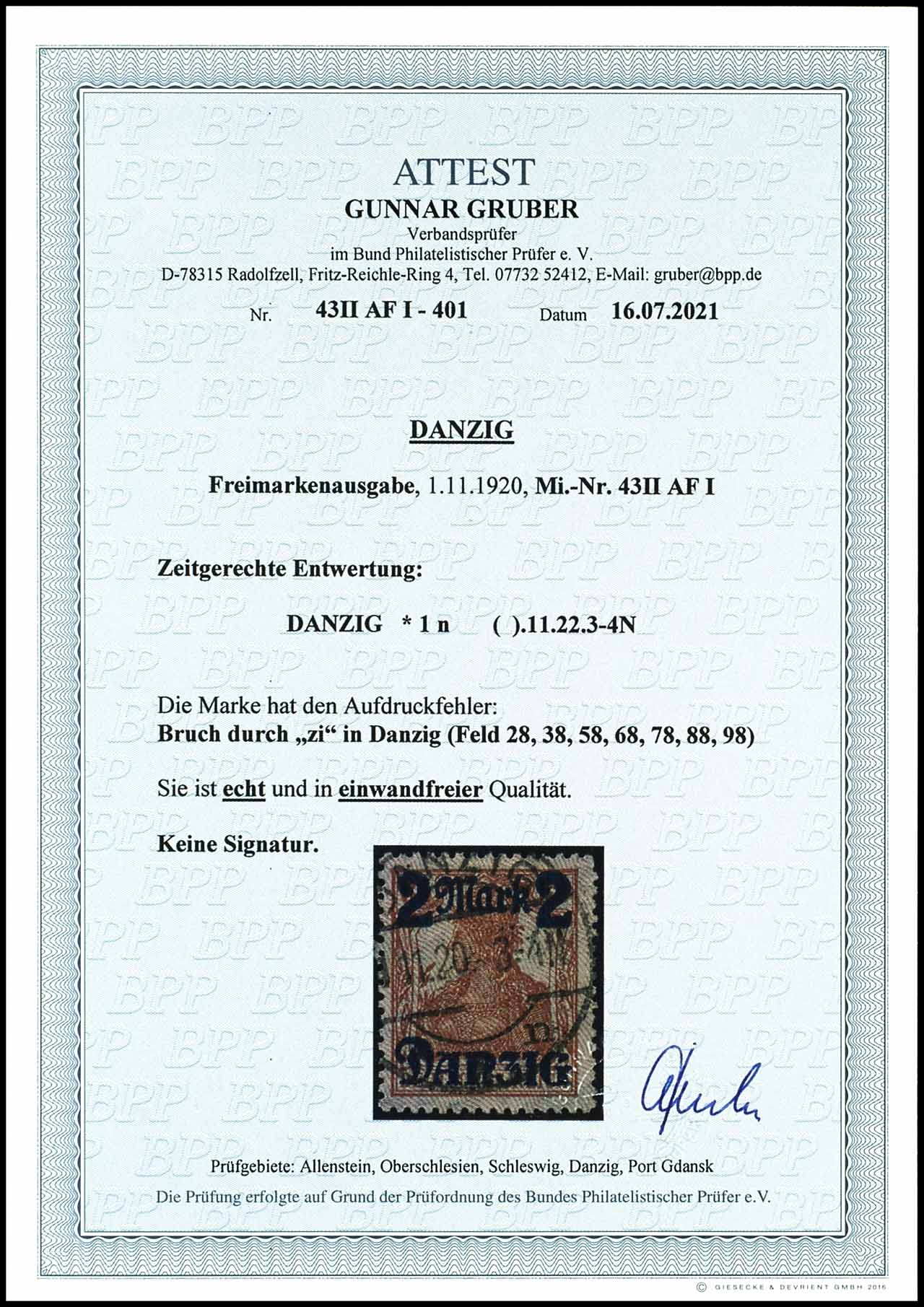 2 Mark auf 35 Pfennig Germania mit Netzunterdruck lebhaftlilagrau, Spitzen nach unten, mit Aufdruckfehler I "Bruch durch "zi" von Danzig", zeitgerecht entwertet "DANZIG * 1 n ....11.22.3-4N", tadellose Erhaltung, unsigniert, Attest Gunnar Gruber BPP (2021) "echt und einwandfrei", Mi. 1.500.-