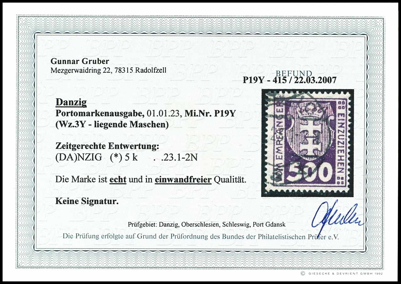 500 Mark Portomarke, Wasserzeichen 3 Y (liegende Maschen), zeitgerecht entwertet, tadellose Erhaltung, unsigniert, Fotobefund Gunnar Gruber BPP "in einwandfreier Qualität.", Mi. 400.-