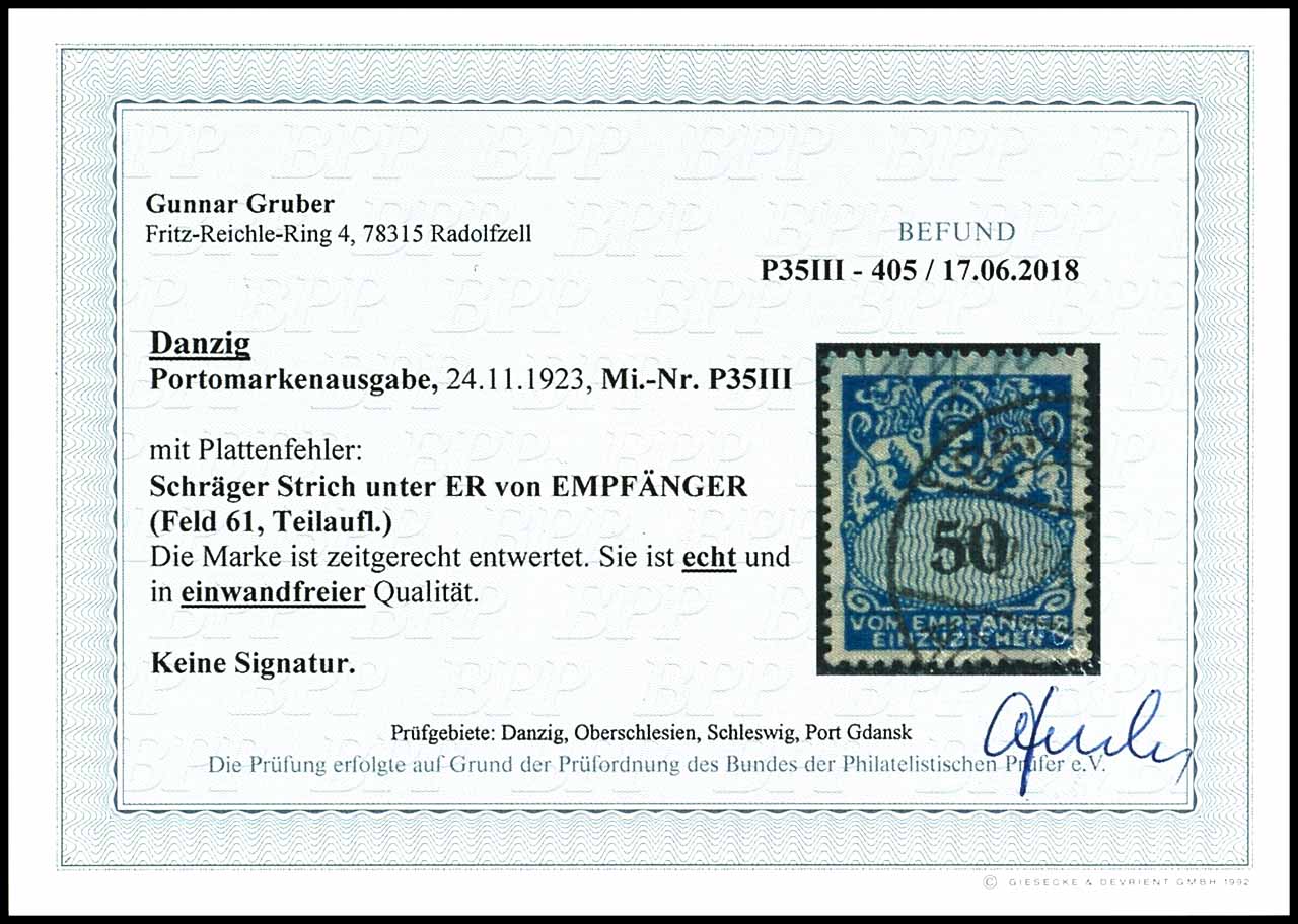 50 Pfennig Portomarke, Plattenfehler III "schräger Strich unter ER von EMPFÄNGER" (Feld 61, Teilauflage), zeitgerecht entwertet, tadellose Erhaltung, Fotobefund Gunnar Gruber BPP "in einwandfreier Qualität."
