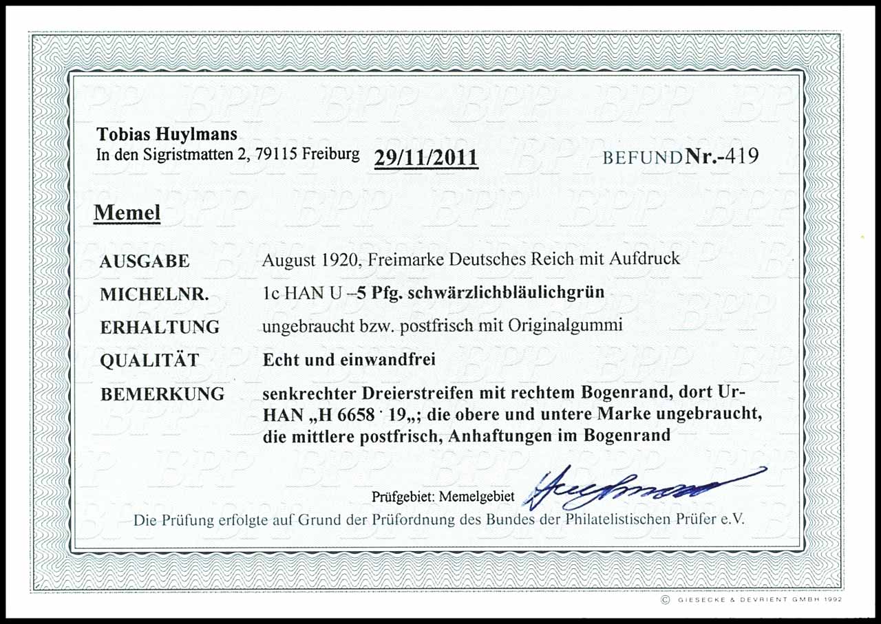 5 Pfennig Germania mit schwarzem Buchdruckaufdruck "Memelgebiet", schwärzlichbläulichgrün, senkrechter Dreierstreifen mit UR-HAN H6658.19 und Form-Nr. 2 im rechten, nicht durchgezähnten Bogenrand, tadellos, obere und untere Marke sind ungebraucht, mittlere Marke postfrisch, Anhaftungen im Bogenrand, Fotobefund Tobias Huylmans BPP "echt und einwandfrei", Mi. 660.-+