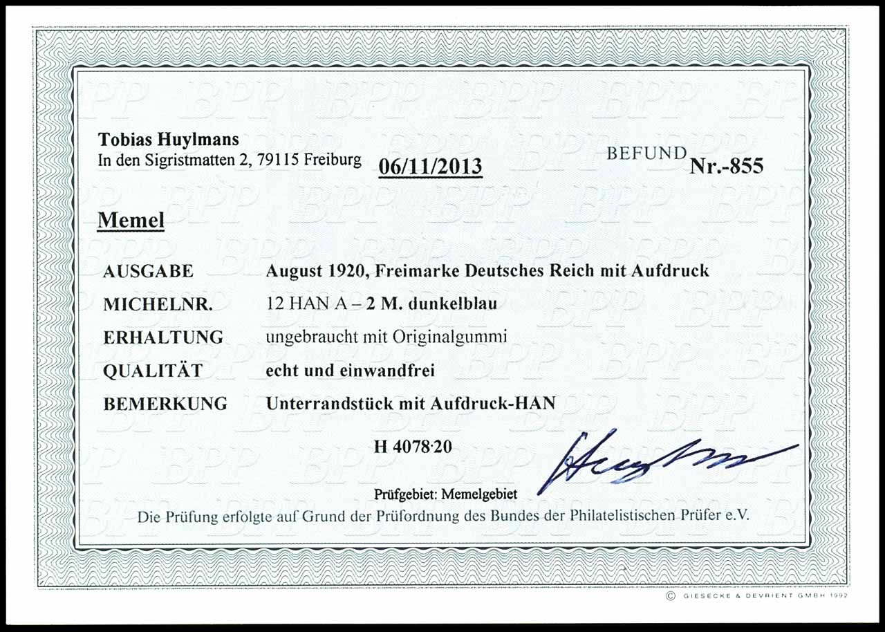 2 Mark mit schwarzem Buchdruckaufdruck "Memelgebiet", dunkelblau, Unterrandstück mit Aufdruck-HAN H 4078.20, ungebraucht, tadellos, Befund Tobias Huylmans BPP "echt und einwandfrei", Mi. 180.-