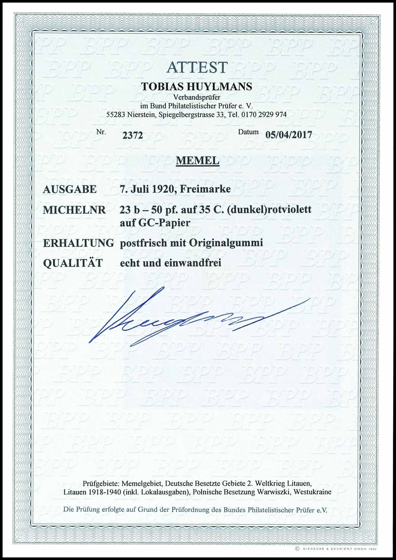 35 Centimes mit schwarzem Buchdruckaufdruck "MEMEL 50 pfennig", dunkelrotviolett auf GC-Papier, postfrisch, tadellos, Fotoattest Tobias Huylmans BPP (2017), "echt und einwandfrei", Mi. 600.-
