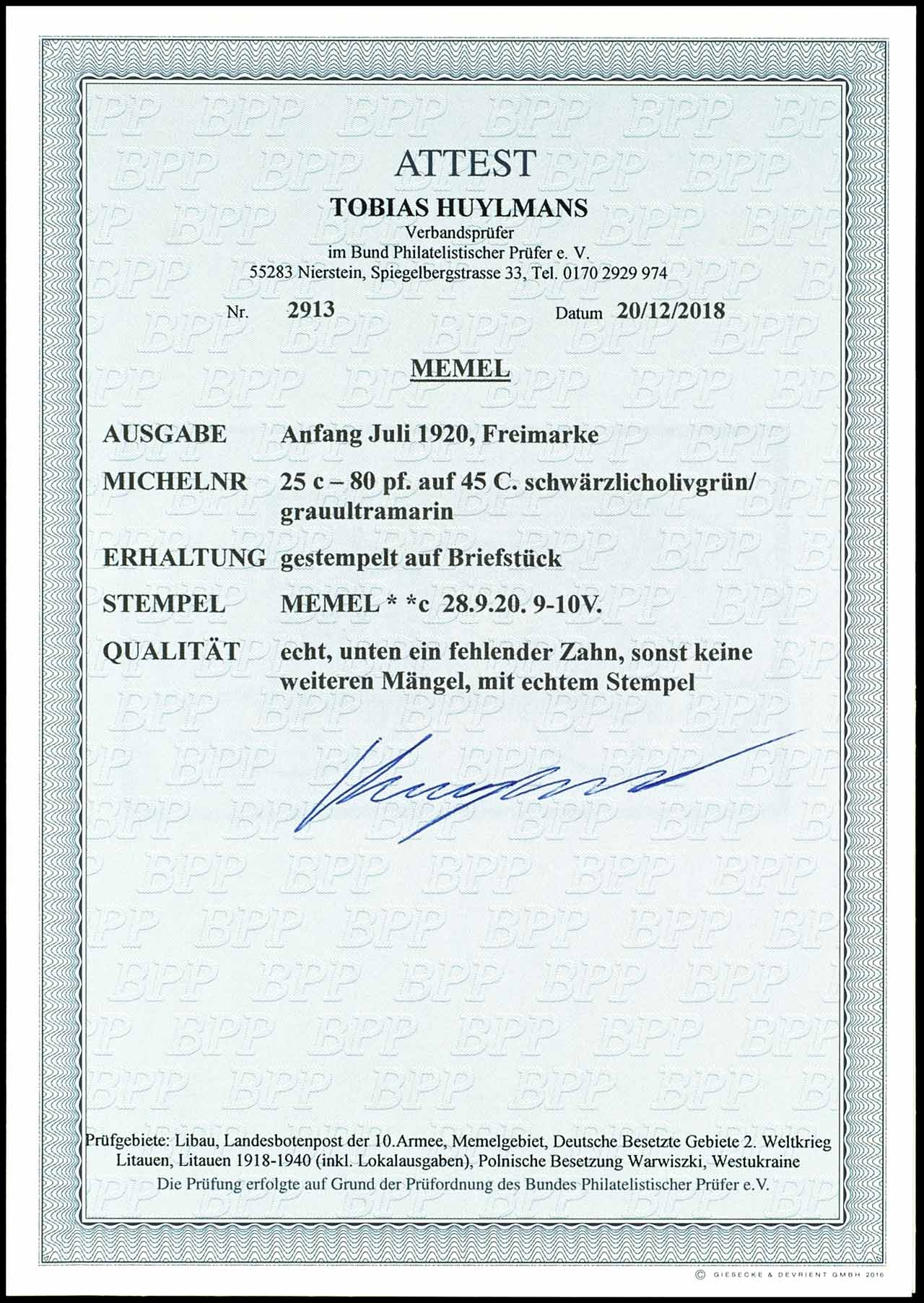 45 Centimes mit schwarzem Buchdruckaufdruck "MEMEL 80 pfennig", schwärzlicholivgrün/grauultramarin auf GC-Papier gestempelt "MEMEL * * c 28.9.20 9-10V" auf Briefstück, unten ein fehlender Zahn, ansonsten tadellos, Fotoattest Tobias Huylmans BPP, Mi. 800.-